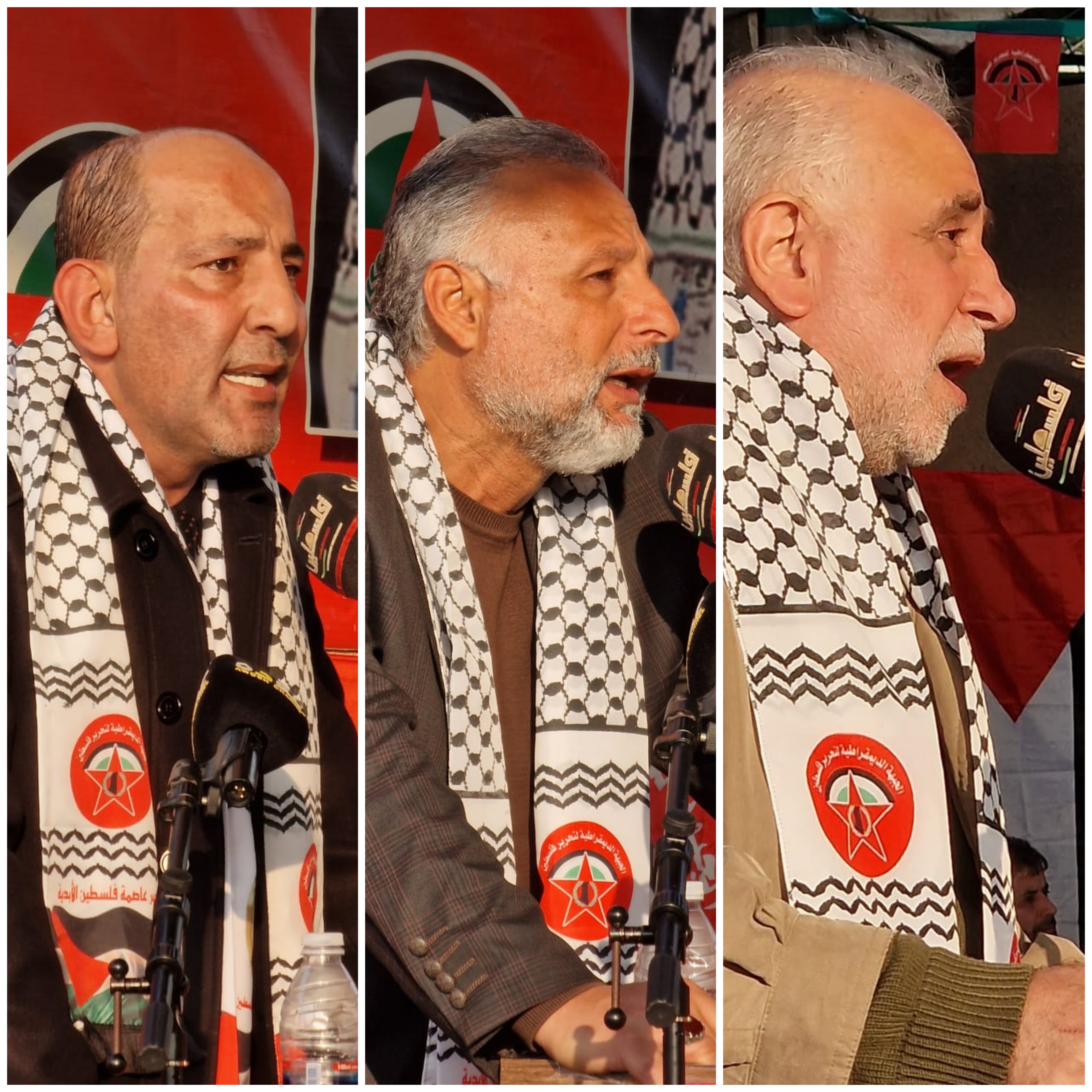 *كلمة الجبهة الديمقراطية القاها عضو المكتب السياسي للجبهة الرفيق يوسف أحمد* توجه خلالها بتحية الفخر والاعتزاز لابطال المقاومة وثوار الانتفاضة الذين يسطرون البطولات في أزقة نابلس جبل النار وجنين الصمود وطولكرم والخليل والقدس.. حيث يكتب تاريخ النصر لشعب جذوره النضالية ضاربة في اعماق التاريخ ... مؤكداً بأن دماء ووصايا شهداء نابلس وكل الشهداء ستبقى أمانة في اعناقنا، وستكون وقوداً للانتفاضة الشعبية التي أعلنها شعبنا خياراً وطريقا لمواجهة العدوان وحكومة اليمين الفاشي الصهيوني.