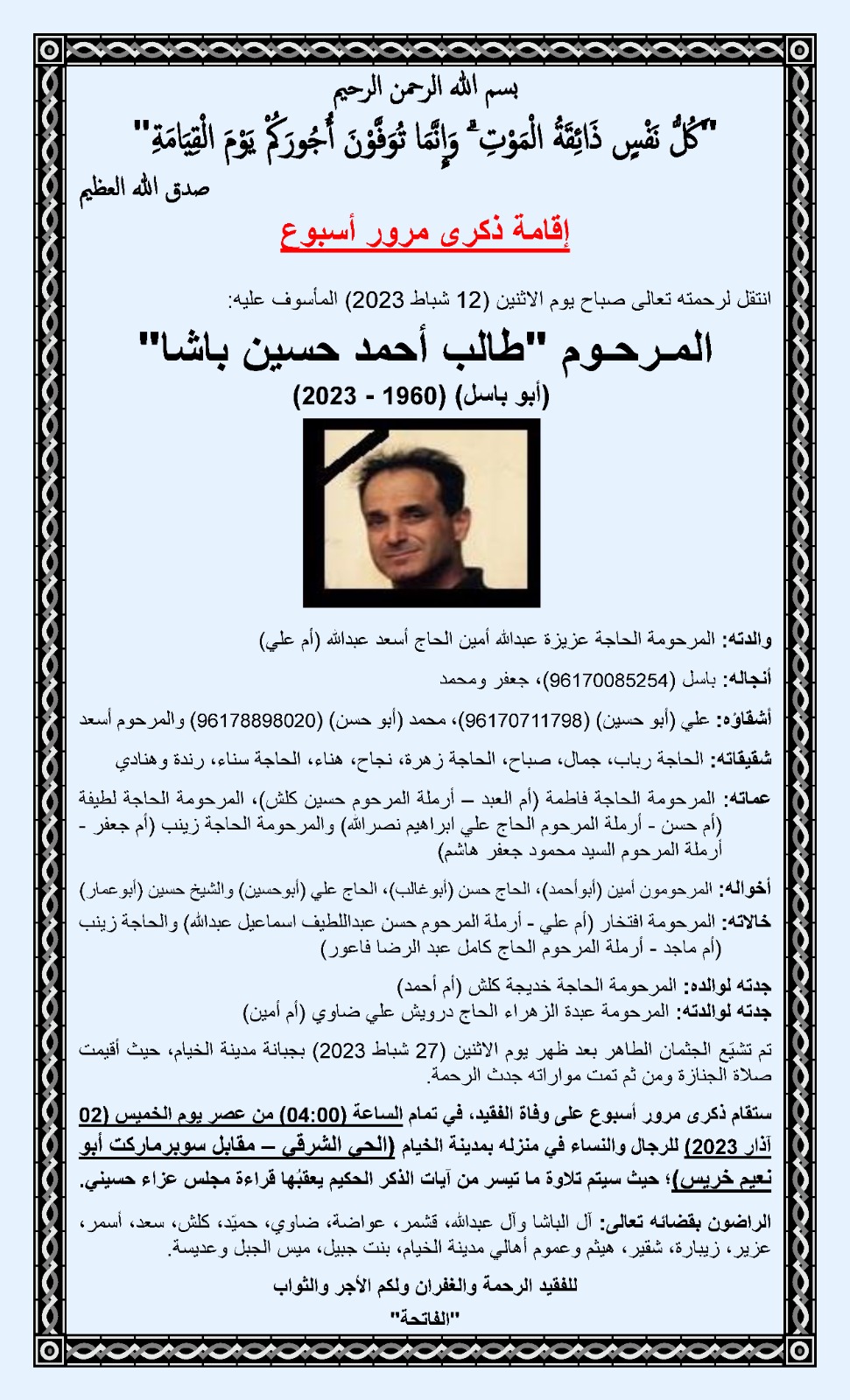 أشقاؤه: علي (أبو حسين) (96170711798)، محمد (أبو حسن) (96178898020) والمرحوم أسعد