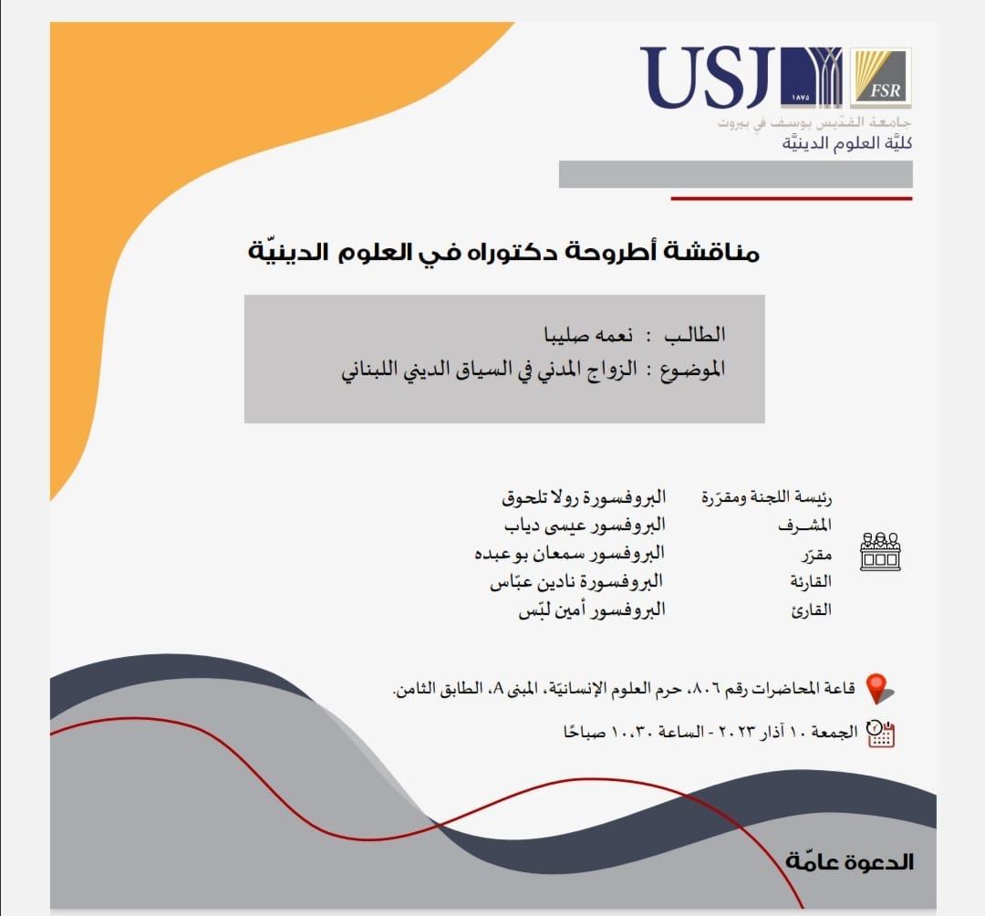 يوم الجمعة، الواقع فيه العاشر من شهر آذار/ مارس الجاري، ناقش الأب نعمة صليبا، كاهن رعيّة القدّيسين بطرس وبولس للروم الأرثوذكس في الحازميّة أطروحة دكتوراه بعنوان «الزواج المدنيّ في السياق الدينيّ اللبنانيّ»، وذلك في كلّيّة العلوم الدينيّة التابعة للجامعة اليسوعيّة في بيروت. وقد أشرف على الأطروحة القسّ البروفسور عيسى دياب (لاهوت)، وترأسّت اللجنة المناط بها تقييم الأطروحة البروفسورة رولا تلحوق (لاهوت). واشترك في مناقشة الرسالة كلّ من الأب البروفسور سمعان بو عبده (لاهوت) والبروفسورة نادين عبّاس (فلسفة) والبروفسور أمين لبّس (علوم سياسيّة). وقد نال واضع الرسالة عن جهده البحثيّ تقديراً علميّاً بمرتبة «مشرّف جدّاً».