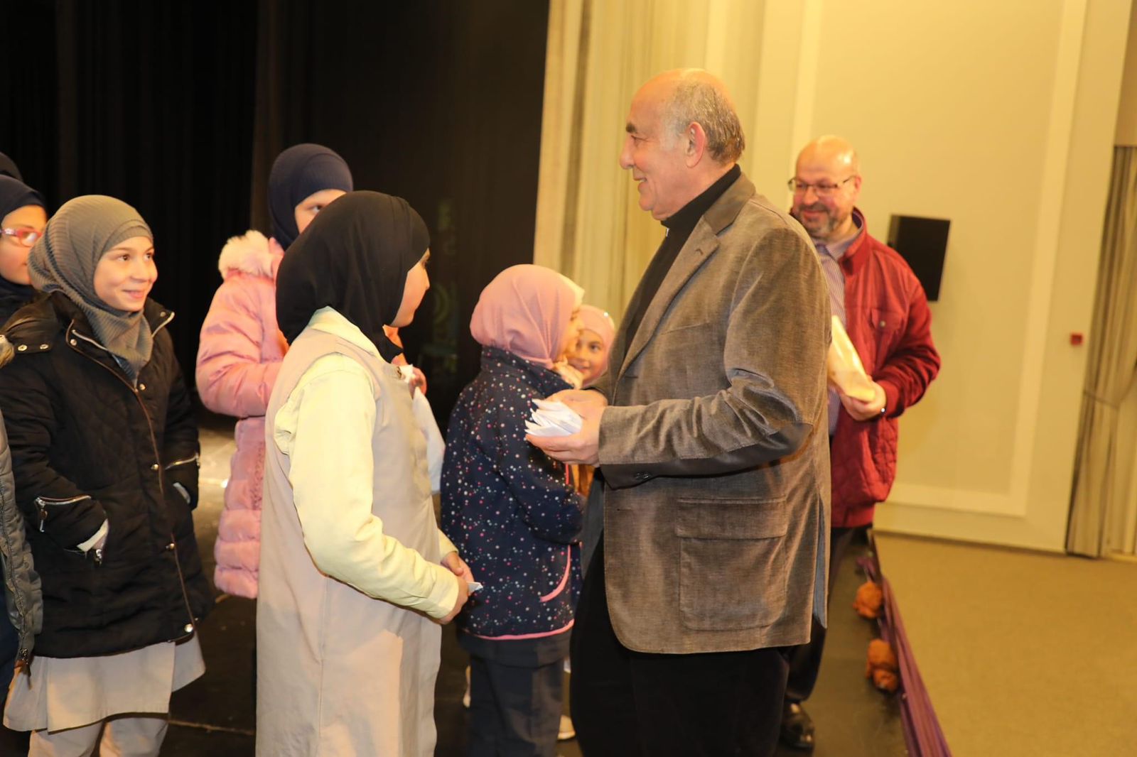 ومن ثم اعتلى خشبة المسرح "الحاج أبو حسن" حيث قام بالسلام والتحية على أحبابه تعالى موزعاً عليهم إكراميات الشهر الفضيل. وتم التقاط بعض من الصور التذكارية لهم بمعية الحاج النبيل بهذه المناسبة الخاصة.