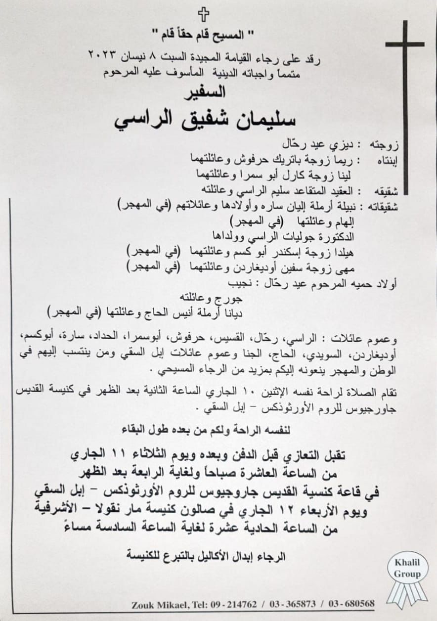 تقام الصلاة لراحة نفسه الساعة الثانية بعد ظهر يوم غد الاثنين 10 نيسان 2023 في كنيسة القديس جاورجيوس للروم الأرثودوكس في بلدته إبل السقي