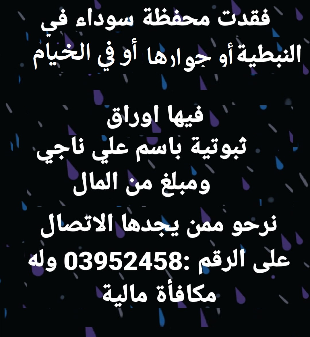 محفظة مفقودة.. مكافأة لمن يجدها م أ ر 20\4\2023 قناة الميادين Google+TwitterFacebookWhatsApp محفظة مفقودة في مدينة النبطية أو في البلدات المجاورة، وربما في بلدتنا الحيام. فيها أوراق ثبوتية بإسم علي ناجي ومبلغ من المال. لمن يجدها، الاتصال على الرقم 03952458 وله مكافأة من صاحبها وأجر عند ربّ العالمين. العودة إلى الصفحة الرئيسية