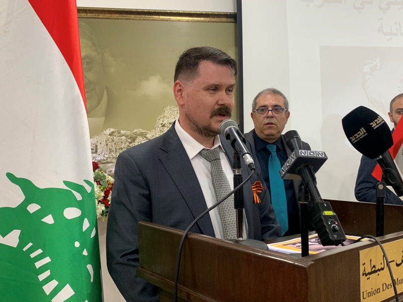 بعد النشيدين اللبناني والروسي ، ألقى رئيس اتحاد رجال الاعمال اللبناني – الروسي اسعد ضيا كلمة ترحيبية ، ثم كلمة لرئيس المركز الثقافي الروسي في بيروت الكسندر سوروكين، الذي اشار الى "الانتصار التاريخي الذي حققته بلاده على الفاشية في الحرب العالمية الثانية ، حيث كان شهر ايار شهر الانتصار الذي نحتفل فيه كل عام. "
