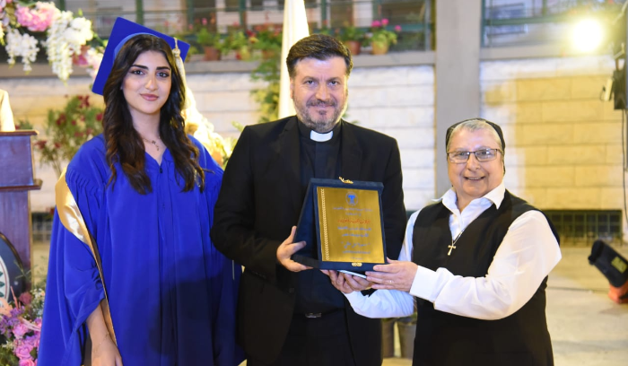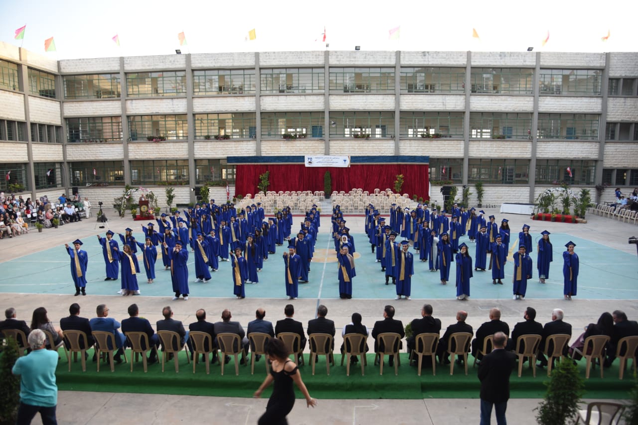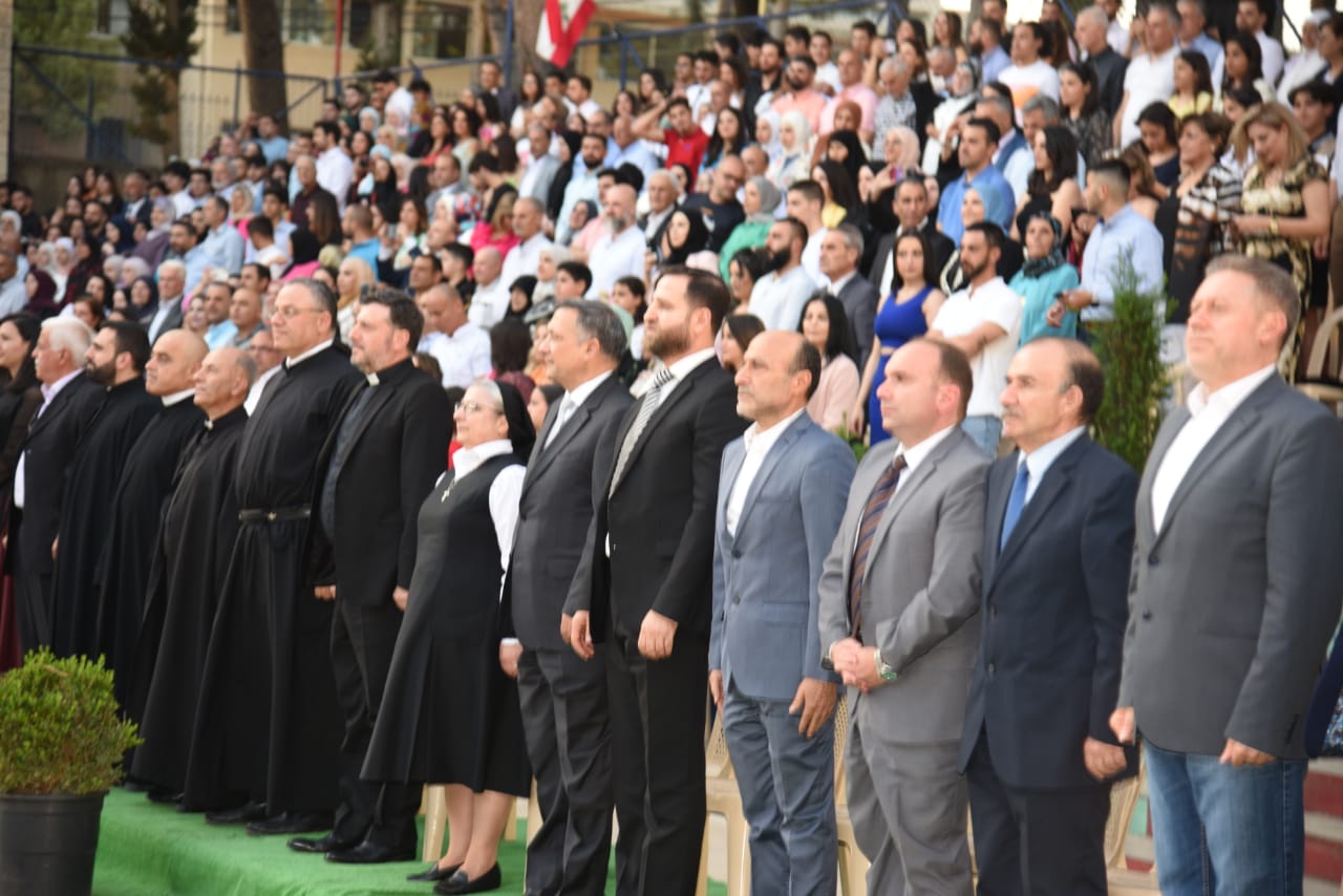 وكانت لوحات فنية لطلاب من الثانوية ، ثم ألقت رئيسة الثانوية الأخت ماري توما كلمة قالت فيها: يطيب لي، بل ويشرّفني أن نلتقي اليوم في محراب الكلمة والحرف، في صرح امتدّت جذوره عميقاً في نفوس المحبّين، قبل أن يمتدّ في ثنايا الزمان والمكان، وجامعنا رابط المحبّة والعلم، مع رائد من روّاد التربية والتعليم، و لن أسدي لكم اليوم نصائح ايها الطلاب، فقد سمعتموها كثيراً من أهلكم ومعلّميكم، وإنما سأكتفي لأذكّركم بما ستواجهونه في معترك الحياة من مصاعب، ولكن، بزاد الخير والمحبّة والمعرفة، وبوقوفكم بجانب الحق تذلّلون ما يعترض مسيرتكم، وتفتحون كوّة في جدار المستقبل. فعليكم الرجاء وعليكم الأمل. فانطلقوا إلى دروب النجاح معزّزين بالإيمان والعلم، ومدّوا جسور التواصل بينكم، فأنتم أمل الحاضر وبناة المستقبل. ثقتنا بكم كبيرة ما دمتم تحملون لواء العلم بيد وبالأخرى لواء الإنسان. أنتم أبناء النّور والحقّ والحياة، ولا تنسوا أن تحملوا النبل والرقيّ، شعار تخرّجكم، وشماً على صدوركم أينما حللتم، تهزأون بالصّعاب، وتجتازونها لتشرقوا شموساً فوق القمم كلّ صباح.