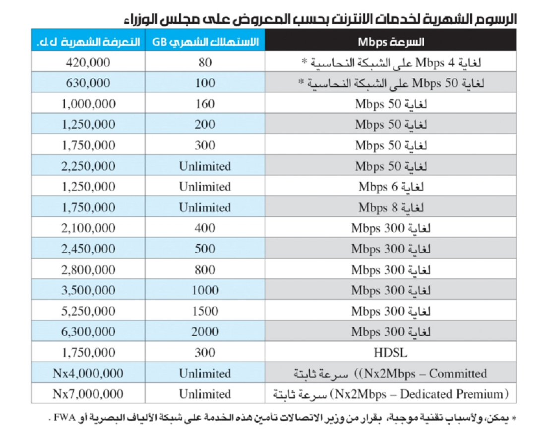 يفترض أن يقرّ مجلس الوزراء، اليوم، مشروع مرسوم زيادة تعرفات خدمات الهاتف الثابت والإنترنت المقدّم عبر أوجيرو وشركات القطاع الخاص بمعدل سبعة أضعاف. عليه، سيصبح سعر باقة الحدّ الأدنى للمشتركين عبر أوجيرو 420 ألف ليرة، وسعر باقة الحدّ الأقصى 7 ملايين ليرة.