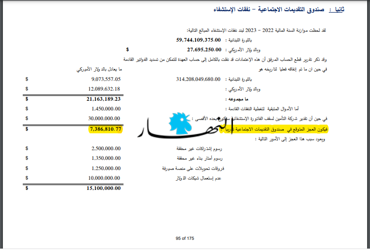يظهر في الصفحة 95/175 من تقرير المندوبين 2022- 2023، أن العجز "المتوقع" في صندوق التقديمات الاجتماعية سيكون تقريبياً 7 ملايين دولار. والاستنتاج كما قيل حصل على أساس إجراء قطع حساب من قبل أمين المال السابق شارل فاخوري الذي انتهت ولايته في نيسان الماضي، بالاستناد إلى فواتير شهرَي كانون الثاني وشباط التي تصل النقابة أو صندوق التقديمات. وفي المستند المرفق أعلاه يشرح فاخوري سبب العجز.