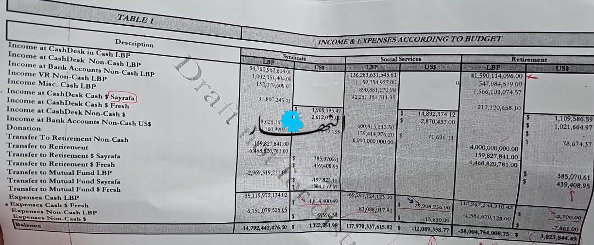 أما في صندوق التقديمات الاجتماعية، محور تحقيقنا، فتُظهر الجداول وجود نحو مليار ليرة في الصندوق، و117 ألف دولار "فريش".