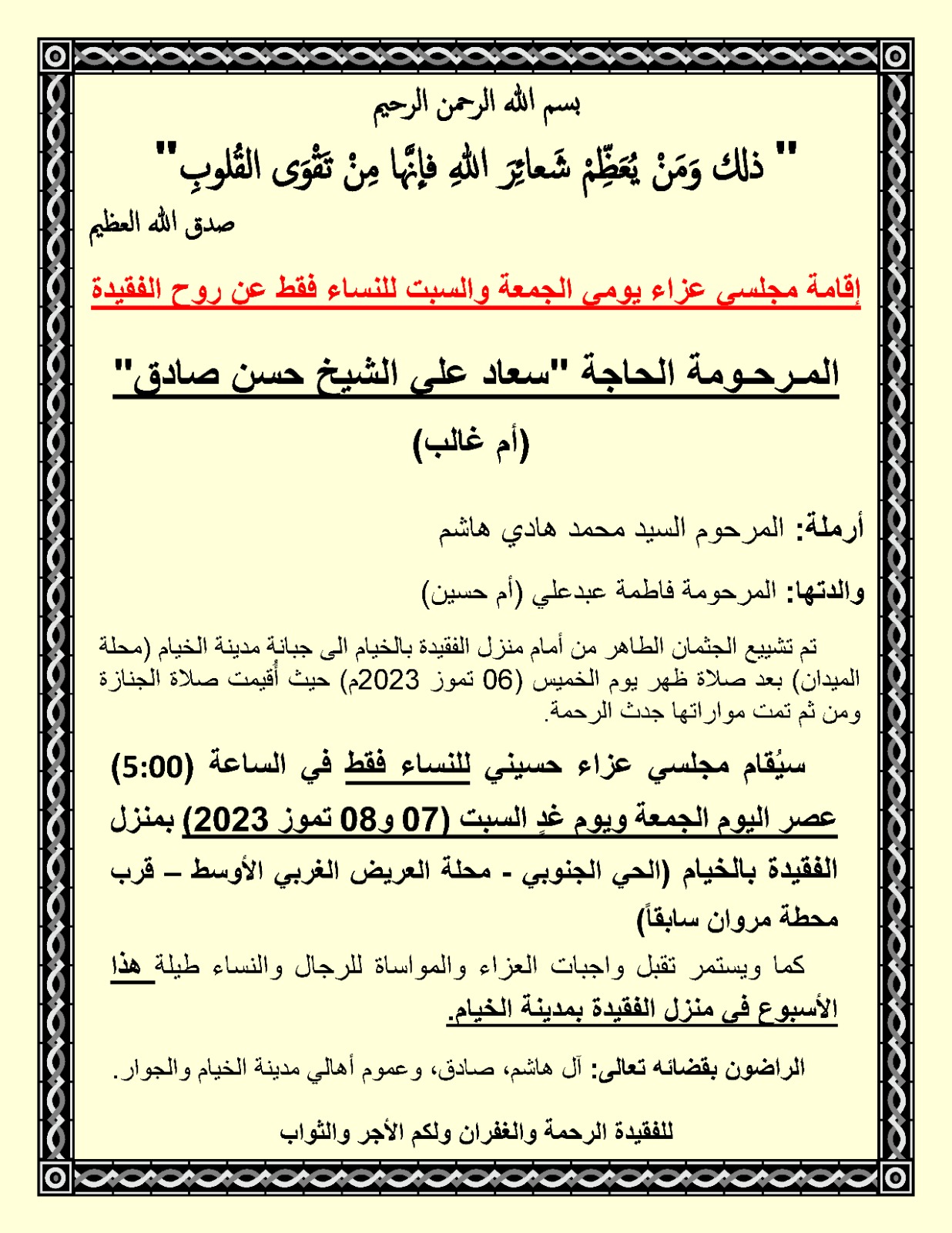 سيُقام مجلسي عزاء حسيني للنساء فقط في الساعة (5:00) عصر اليوم الجمعة ويوم غدٍ السبت (07 و08 تموز 2023) بمنزل الفقيدة بالخيام (الحي الجنوبي - محلة العريض الغربي الأوسط – قرب محطة مروان سابقاً)