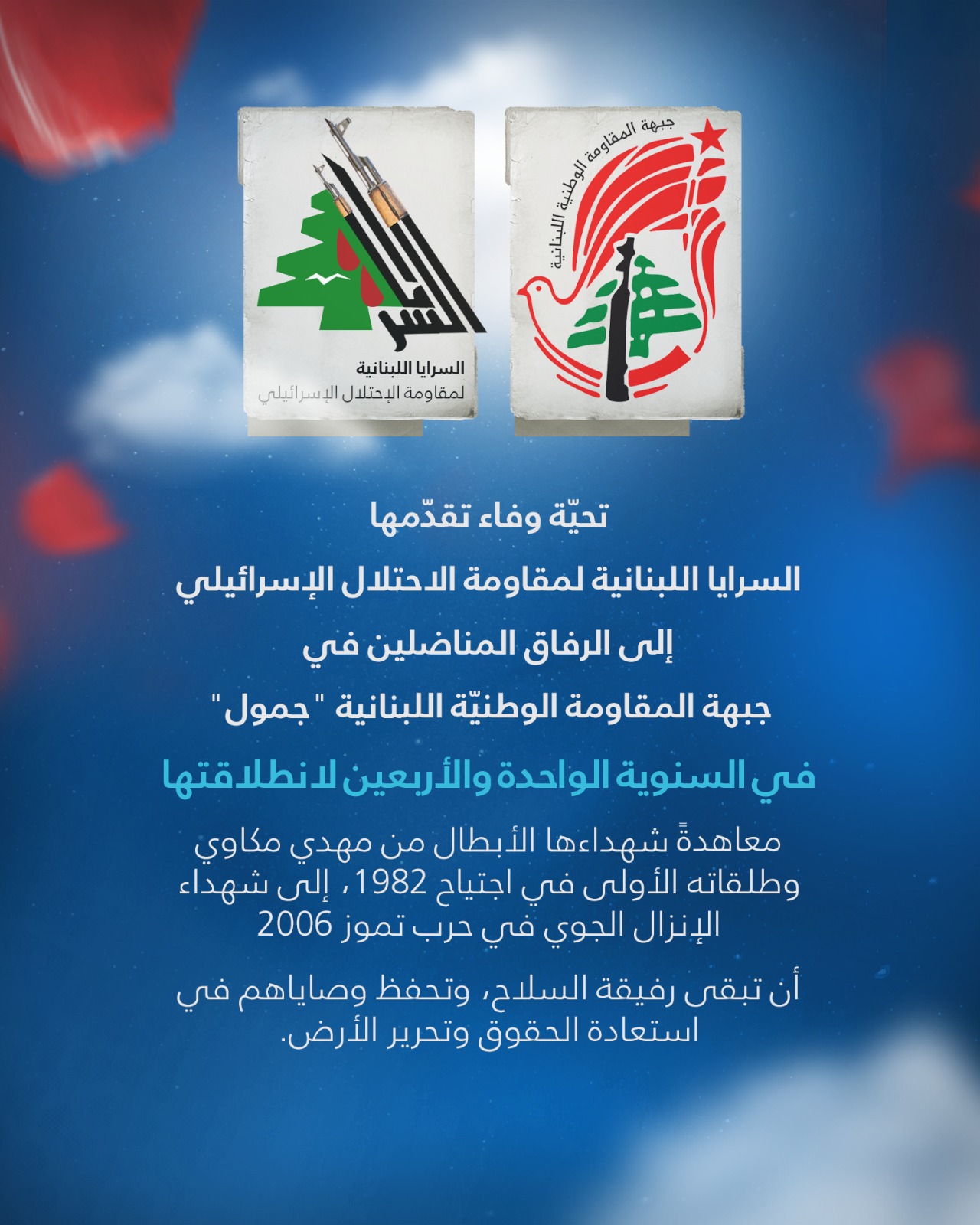 قدمت السرايا اللبنانية لمقاومة الاحتلال الإسرائيلي في بيان " تحية وفاء الى الرفاق المناضلين في جبهة المقاومة الوطنيّة اللبنانية "جمول" في السنوية الواحدة والأربعين لإنطلاقتها
