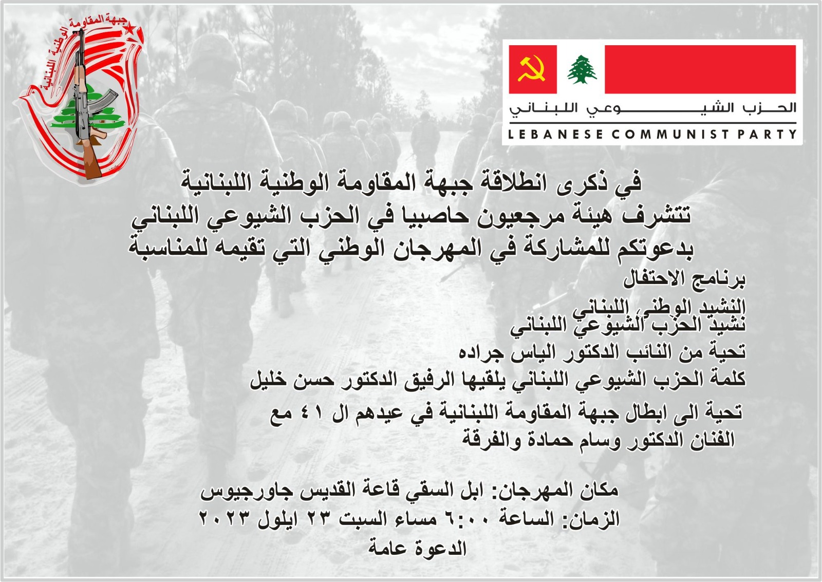 بمناسبة الذكرى الـ 41 لانطلاقة جبهة المقاومة الوطنية اللبنانية، دعت هيئة مرجعيون حاصبيا في الحزب الشيوعي اللبناني للمشاركة في المهرجان الوطني التي تقيمه للمناسبة والذي يتخلله تحية من النائب د. الياس جراده وكلمة الرفيق د.حسن خليل، عضو المكتب السياسي للحزب ومسؤول العلاقات السياسية، كما يتخلله تحية فنية يقدمها الفنان د. وسام حمادة وفرقته.