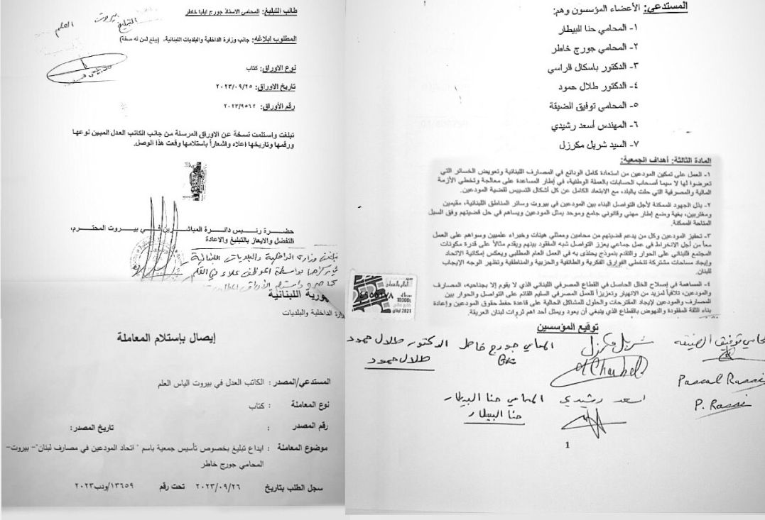 "لكل مودعي لبنان، معاً أقوى" هو الشعار الذي رفعه "اتحاد المودعين في مصارف لبنان" بعد أن أنجز اليوم ٢٦ أيلول ٢٠٢٣ الخطوات القانونية المطلوبة لتأسيسه واكتسابه الشخصية القانونية، وذلك من خلال التقدّم بطلب التأسيس وكافة المستندات اللازمة المرفقة به إلى وزارة الداخلية والبلديات والذي سجّل برقم ودب ٢٠٢٣/١٣٦٥٩ في قلم الوزارة بتاريخ اليوم من ضمن إحاطة الوزارة المختصة بالعلم والخبر العائد لتأسيس الجمعية.