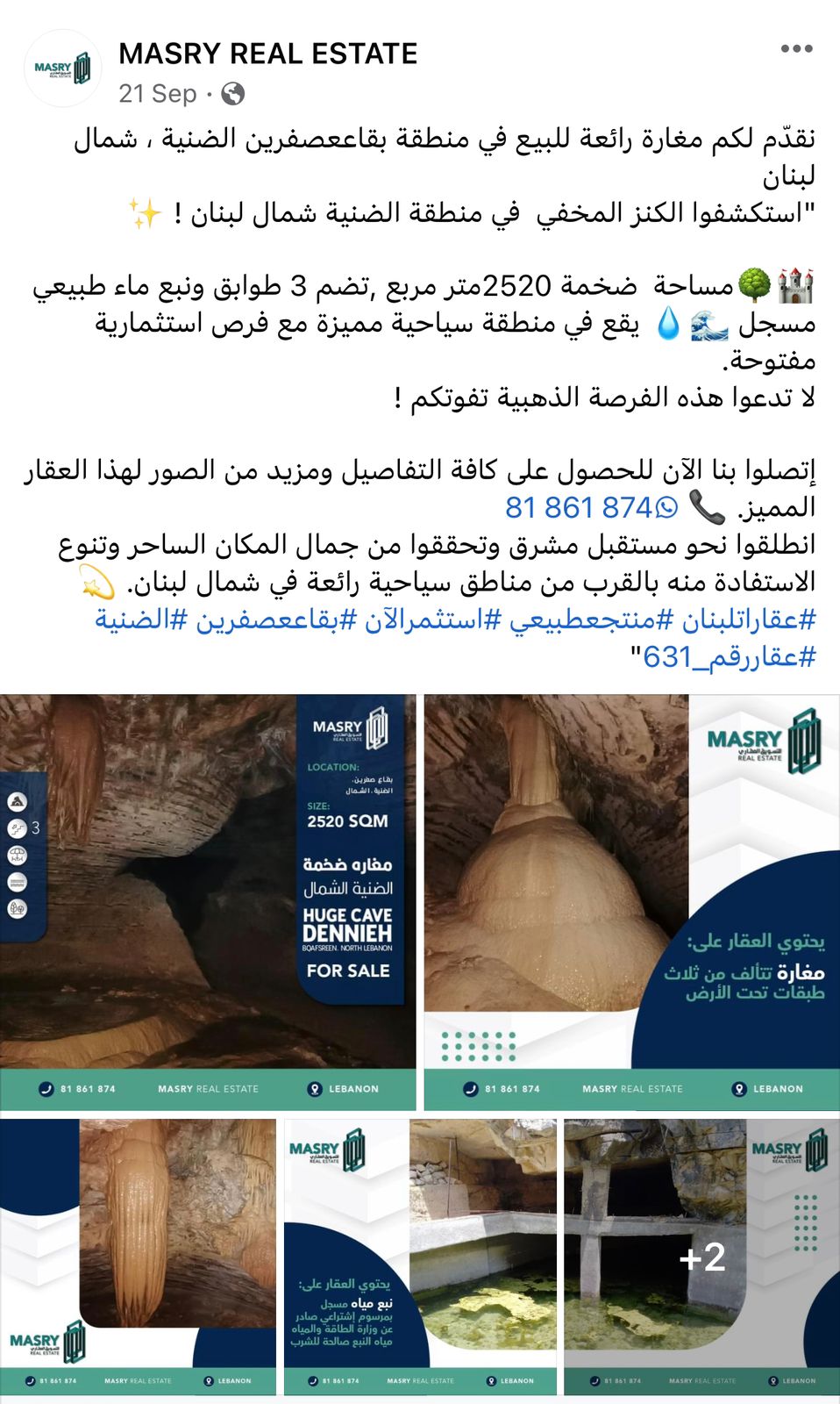 في خبر طرح الكثير من علامات الاستفهام حول ملكية المواقع الأثرية والبيئة، أعادت "الحركة البيئية اللبنانية" نشر إعلان لصفحة بيع عقارات تدعى "MASRY"، وجاء فيه التالي: "نقدم لكم مغارة رائعة للبيع في منطقة بقاععصفرين الضنية، شمال لبنان. استكشفوا الكنز المخفي في منطقة الضنية شمال لبنان. مساحة ضخمة 2520 متر مربع، وتضم 3 طوابق ونبع ماء طبيعي مسجل، يقع في منطقة سياحية مميزة مع فرص استثمارية مفتوحة. لا تدعوا هذه الفرصة الذهبية تفوتكم ".