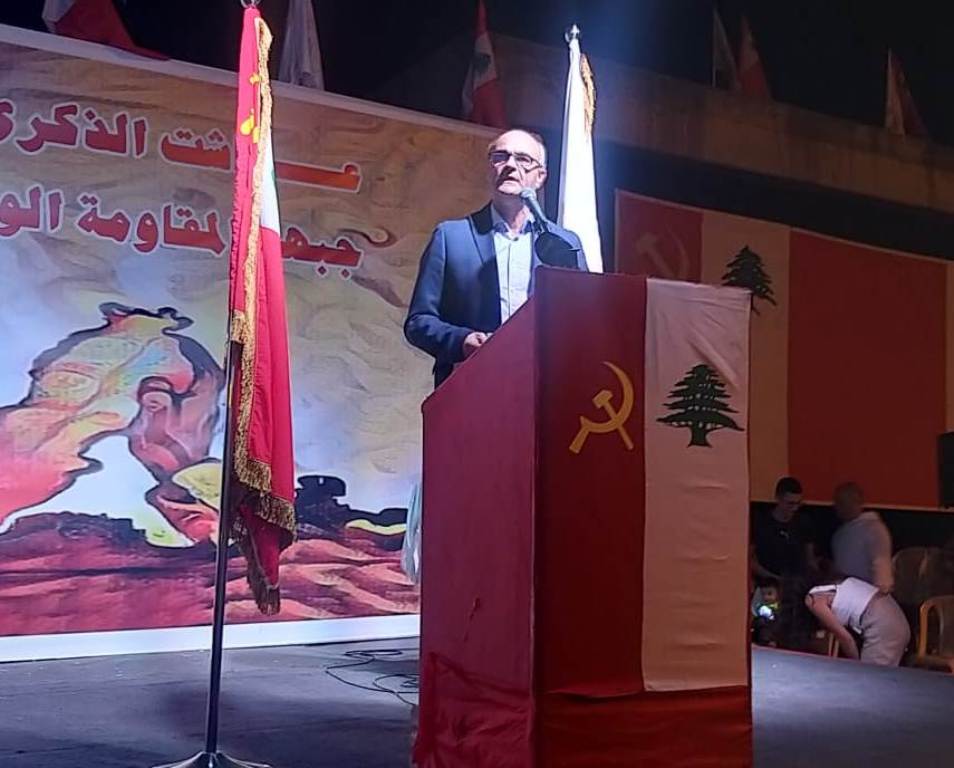اضاف: إن موضوع مقاومة الاحتلال الصهيوني والتصدي لاعتداءاته كان ولا يمكن إلّا أن يكون من أولوياتنا كشعب لبناني وقواه الوطنية؛ هو خيار وطني، في البرنامج والأهداف والقوى، وبهذا المعنى، نحن كشيوعيين لا يمكن أن نكون خارجه. إن إي توظيف لهذا الموضوع في توازنات الداخل سيعرضه إلى التشويه؛ فلا استقواء بالسلاح، كفائض قوى، لتعديل موازين الاصطفافات الداخلية، وفي المقابل، لا تفريط بالمقاومة أو المساومة عليها استجابة لأجندات خارجية، لأن هذا الخيار هو بعهدة ما يقارب القرن من النضال لشعبنا العربي والفلسطيني واللبناني ودفعنا في سبيله أثماناً باهظة. إن المواجهة مع هذا العدو هي مواجهة مع المشروع الأساس الذي جاء منذ قرن من الزمن: مشروع استعماري غربي، أوجد كيانا مصطنعاً في فلسطين، وعليه، فالحل لن يكون إلا بإسقاطه كموقع متقدم للإمبريالية الغربية في منطقتنا وإقامة الدولة الوطنية الفلسطينية على كامل التراب الوطني