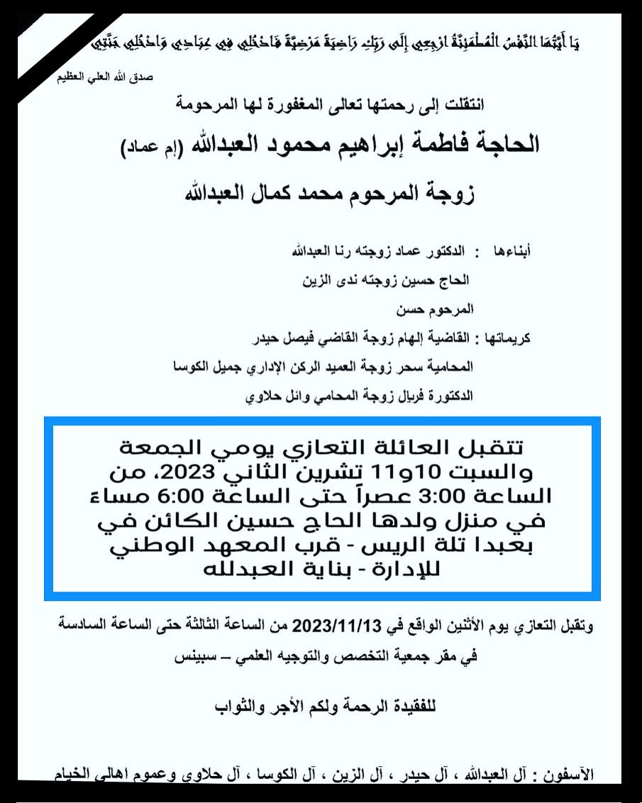 وتتقبل عائلة المرحومة الحاجة فاطمة ابراهيم محمود العبدالله (أم عماد عبدالله) التعازي يومَي الجمعة والسبت في بيروت في منزل نجلها الحاج حسين الكائن في بعبدا - تلة الريس - قرب المعهد الوطني للإدارة - بناية العبدالله
