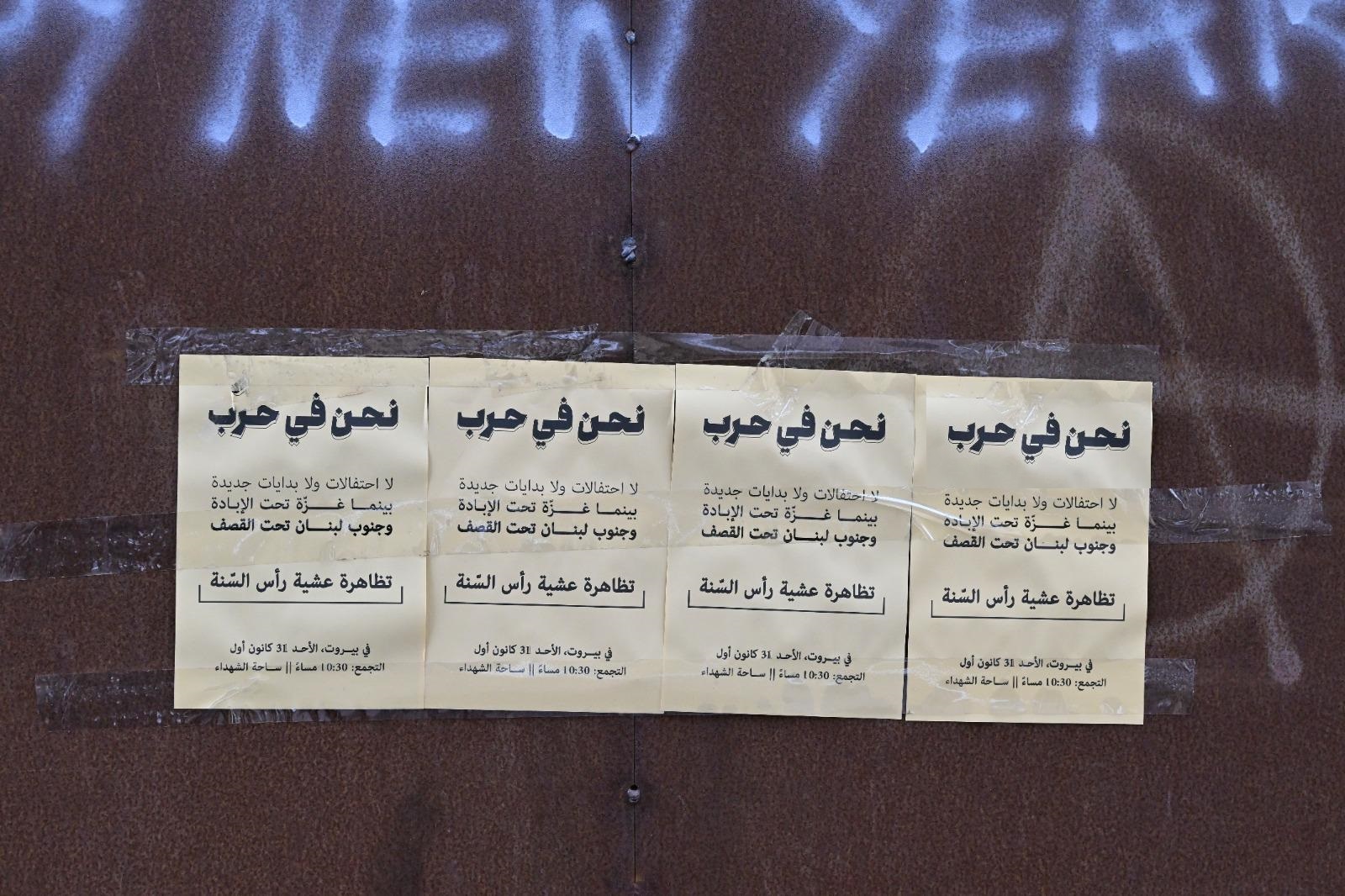 مساء يوم أمس السبت 30 كانون الأول، جالت بعض السيارات في مناطق عدة في بيروت، دعت المواطنين عبر مكبرات الصوت إلى عدم إقامة أي احتفال برأس السنة والامتناع عن الذهاب إلى المطاعم أو الحانات، تحت شعار: "نحن في حرب، لا احتفالات ولا بدايات جديدة بينما غزة تحت الإبادة وجنوب لبنان تحت القصف". كما دعت إلى "تظاهرة عشية رأس السنة" في ساحة الشهداء، عند العاشرة والنصف مساءً، من أجل التضامن مع غزة. وتعمدت تلك السيارات التجوال في الشوارع التي تتكثف فيها المؤسسات السياحية ونوادي السهر والمطاعم. كما جاء الدعوات بنبرة لا تخلو من الزجر والاستفزاز وبنيّة منع أي مظاهر احتفالية، ما قد يسبب جواً متوتراً أو يخلق إشكالات أو حتى صدامات.