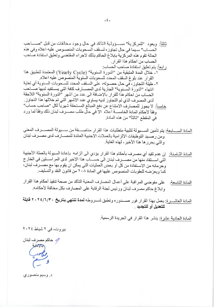 وكان المجلس خصّص قسماً كبيراً من جلسته الطويلة لدرس التعميم بعدما اتفق منصوري مع رئيس الحكومة نجيب ميقاتي على تعديلاته. وتوقّف المجتمعون طويلاً عند بندَين كانا الأكثر إثارة للجدل «تجارة الشيكات» والمعايير التي تؤهّل المودع للاستفادة من التعميم.