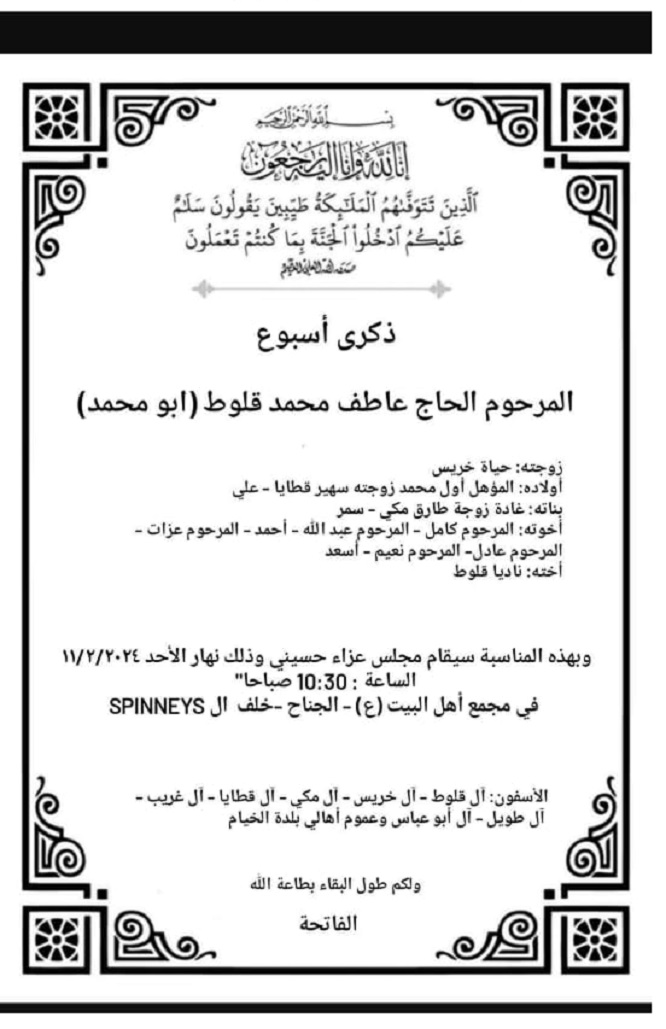 لمناسبة مرور أسبوع على وفاة المرحوم الحاج عاطف محمد قلوط (أبو محمد)..