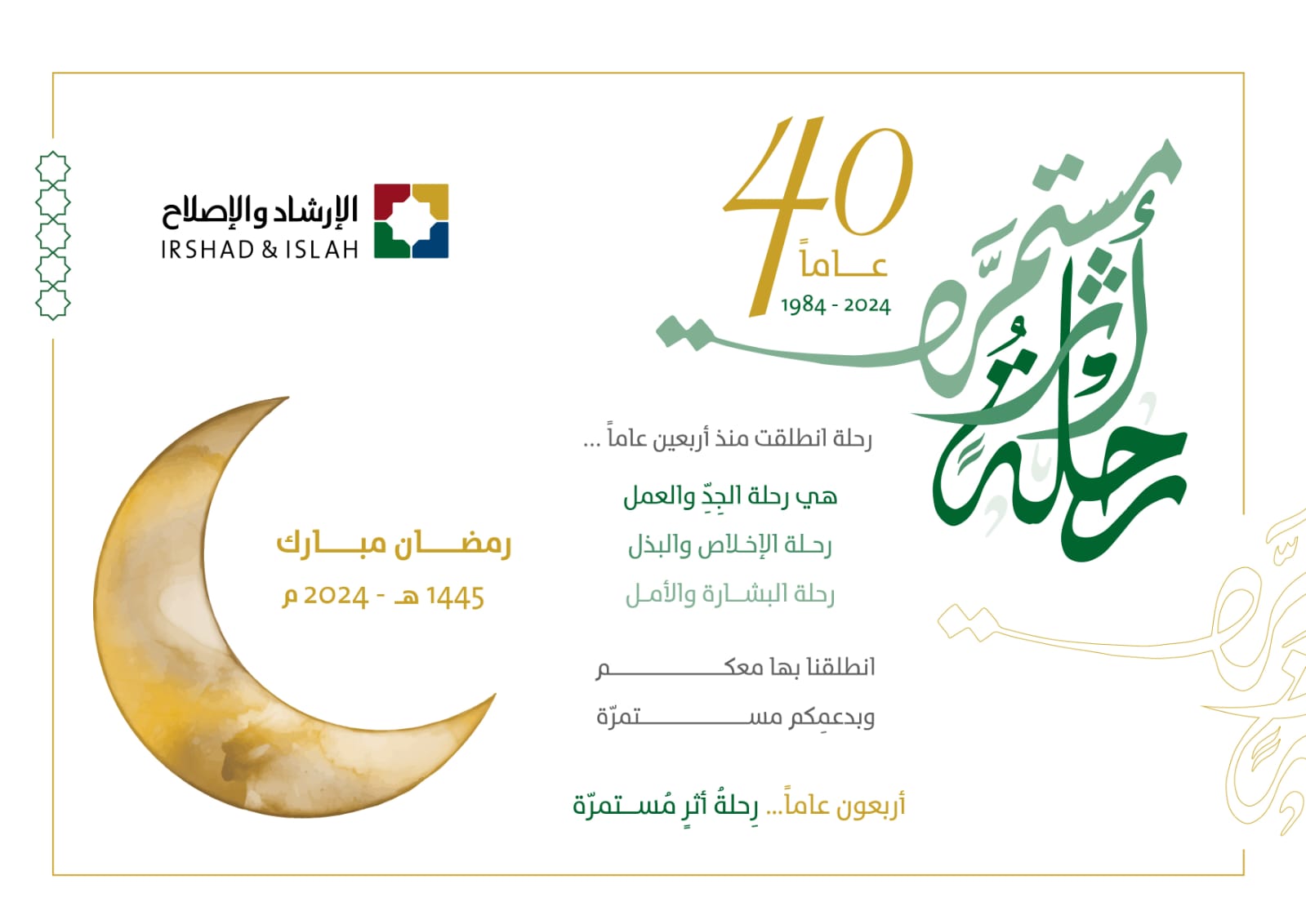 أطلقت جمعية الإرشاد والإصلاح الخيرية الإسلامية حملة رمضان لهذا العام، والتي تتزامن مع الذكرى الـ 40 لتأسيسها، تحت شعار "40 عاماً... رحلة أثر مستمرة". وتوجه رئيس الجمعية المهندس جمال محيو إلى أهل الجمعية ومحبيها برسالة جاء فيها: