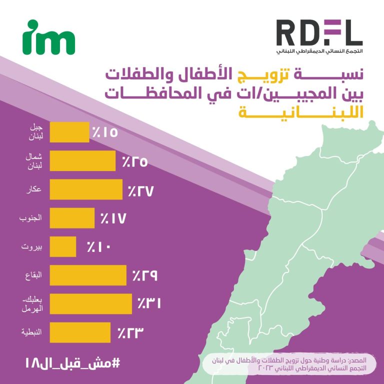 تعرض رشا وزنة، مسؤولة الحملات والتواصل في التجمّع النسائيّ الديمقراطيّ لـ”مناطق نت” أرقام الإحصاءات في الدراسة فتكشف “أن 20 بالمئة من مجيبات الدراسة تمّ تزويجهنّ بين عمر 13 و15 عامًا”. وتوزّعت نسب تزويج الأطفال في مختلف المحافظات اللبنانيّة على الشكل الآتي: 15 بالمئة في محافظة جبل لبنان، و25 بالمئة في جبل لبنان، و25 بالمئة في شمال لبنان، و27 بالمئة في عكار، و17 بالمئة في الجنوب، و23 بالمئة في النبطية و29 بالمئة في البقاع. أمّا أعلى نسبة تزويج القاصرات فكانت في بعلبك- الهرمل إذا بلغت 31 بالمئة. وبالتالي سجّلت النسبة الأدنى في بيروت وبلغت 10 بالمئة.