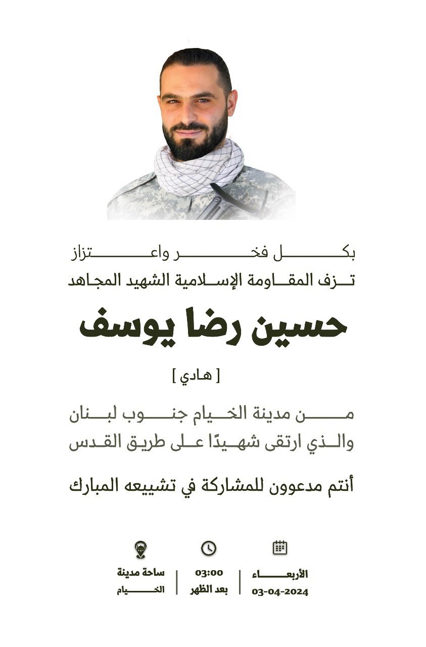 ينطلق تشييع الشـهيد عند الثالثة بعد ظهر يوم غدٍ الأربعاء 3 نيسان 2024 من ساحة البلدة.