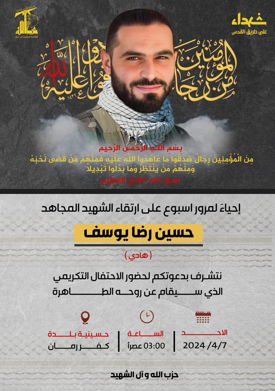 الاحد 7 نيسان: ذكرى اسبوع الشهيد حسين رضا يوسف في حسينية كفرمان م أ ر 5\4\2024 موقع خيامكم Google+TwitterFacebookWhatsApp لمناسبة مرور أسبوع على استشهاد المجاهد الشهيد على طريق القدس حسين رضا يوسف (هادي)، تقام الذكرى عصر يوم الأحد 7 نيسان 2024 من الساعة الثالثة لغاية الخامسة في حسينية بلدة كفرمان.