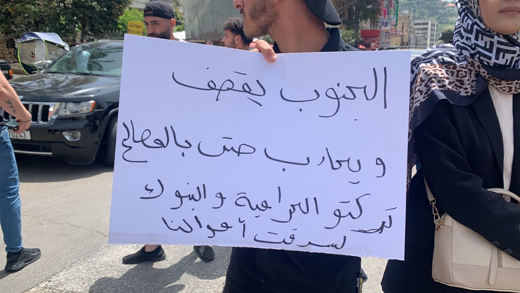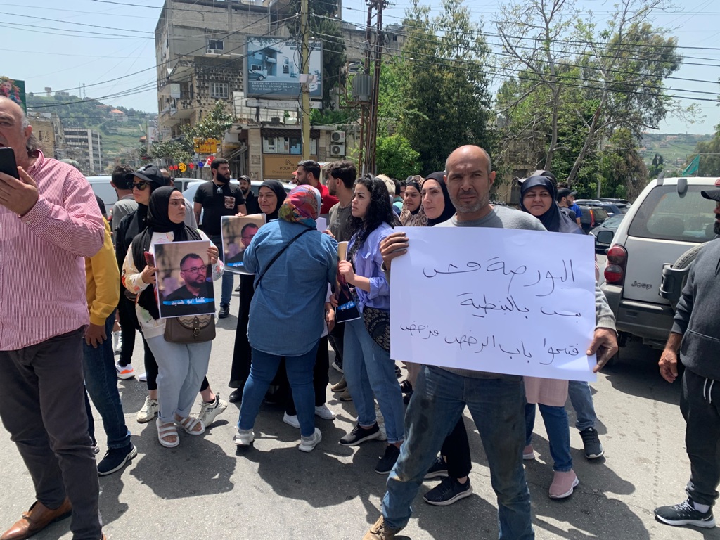 ورفع الاهالي الذين تجمعوا وسط الطريق رافعين صور لابنائهم الموقوفين ولافتات كتب على بعضها " البورصة مش بس بالنبطية ، فتحوا باب الرخص ومنرخص" ، و " الجنوب يقصف ويحارب حتى بالمصالح ، تركتوا الحرامية والبنوك اللي سرقت اموالنا"، واطلقوا هتافات تطالب باطلاق ابنائهم ، داعيين لتطبيق القانون في كل لبنان وليس في النبطية فقط، وفتح باب الترخيص لتكون " مكاتبنا قانونية" ، داعيين القضاء لبسط سلطته واحكامه على البنوك " التي حجزت اموال المغتربين والمزارعين والمتقاعدين والعمال".