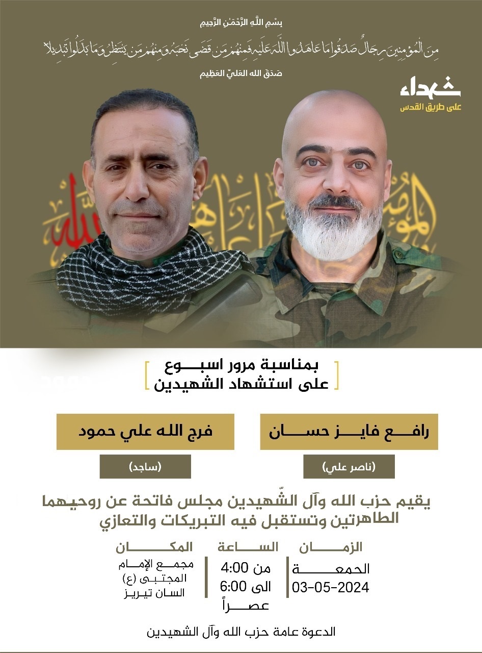 لمناسبة مرور أسبوع على ارتقاء رافع فايز حسان وفرج الله علي حمود شهيدين، يقيم حـزب الله وأل الشهيدين مجلس فاتحة عن روحيهما الطاهرتين وتُستقبل فيه التبريكات والتعازي