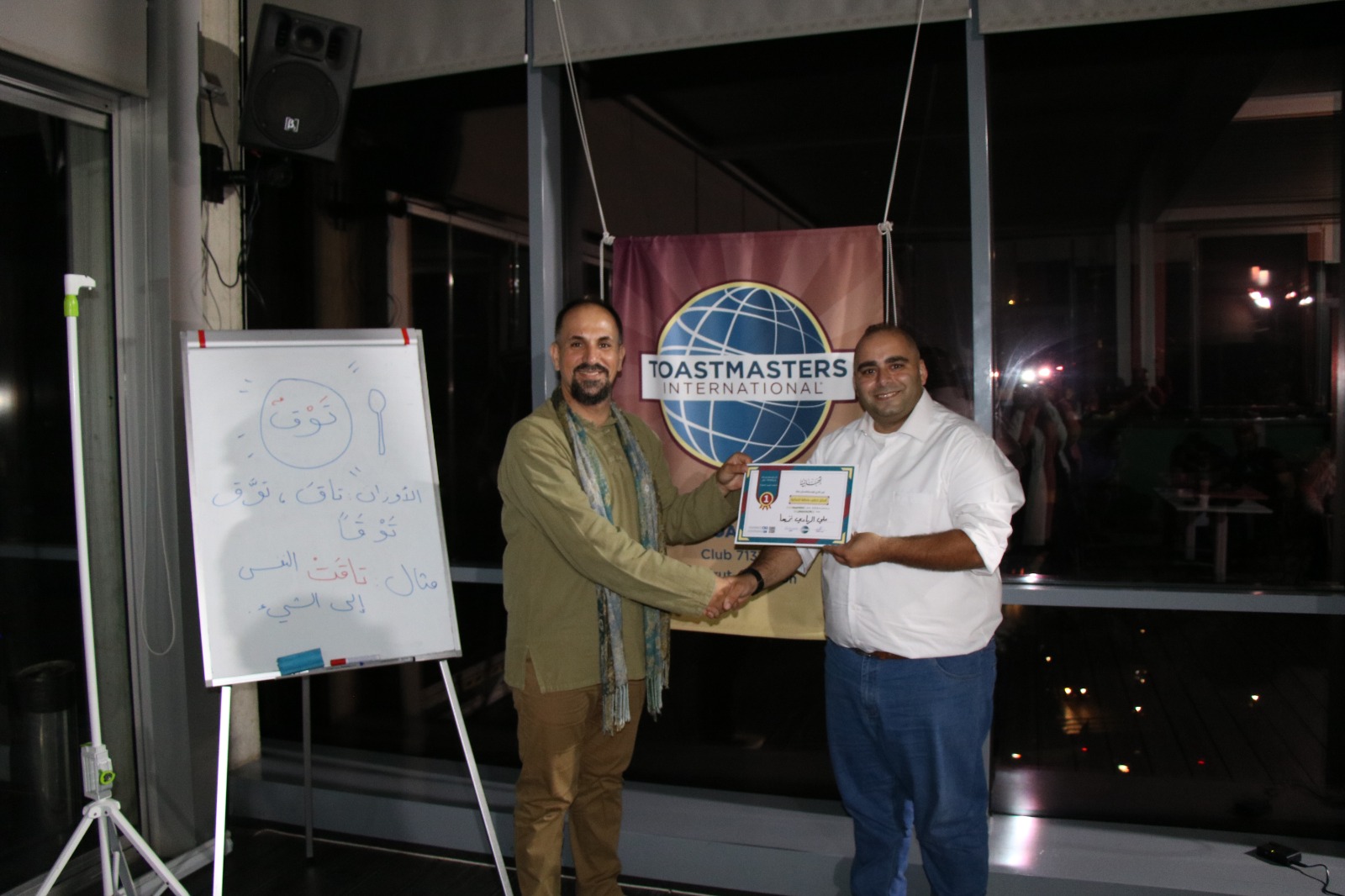 أما الفقرة الأخيرة، فكانت بقيادة المقوّم العام التوستماستر زهراء شعيتو وفريقها الذين شاركوا توصيات عديدة لمساعدة الخطباء على تحسين وتعزيز الأداء من جهة والحديث بلغة عربية سليمة خالية من التلكؤات من جهة ثانية.