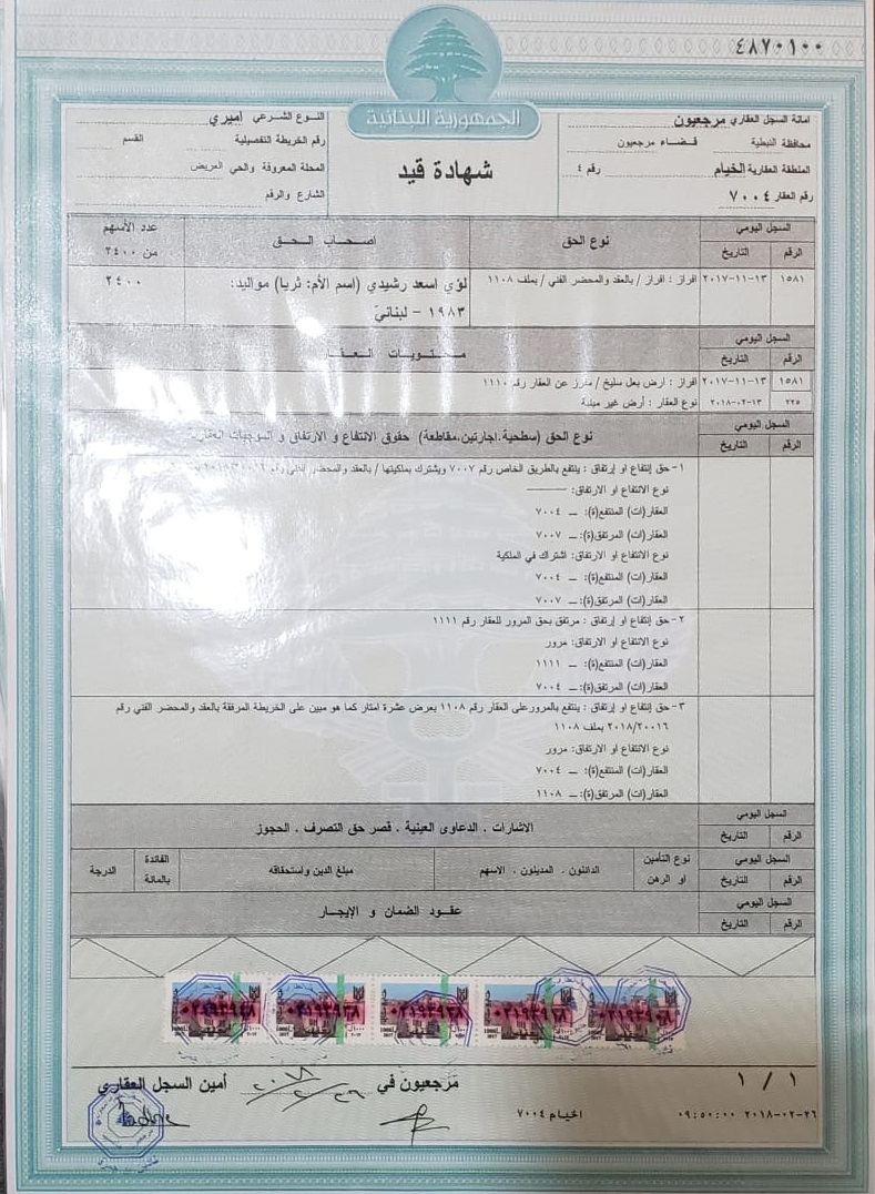 يتمتع العقار بإطلالة رائعة وكاشفة لا تحجب، مطل على "زيتون كرم" وعلى منطقة جبلي وعلى جديدة مرجعيون وجوارها.