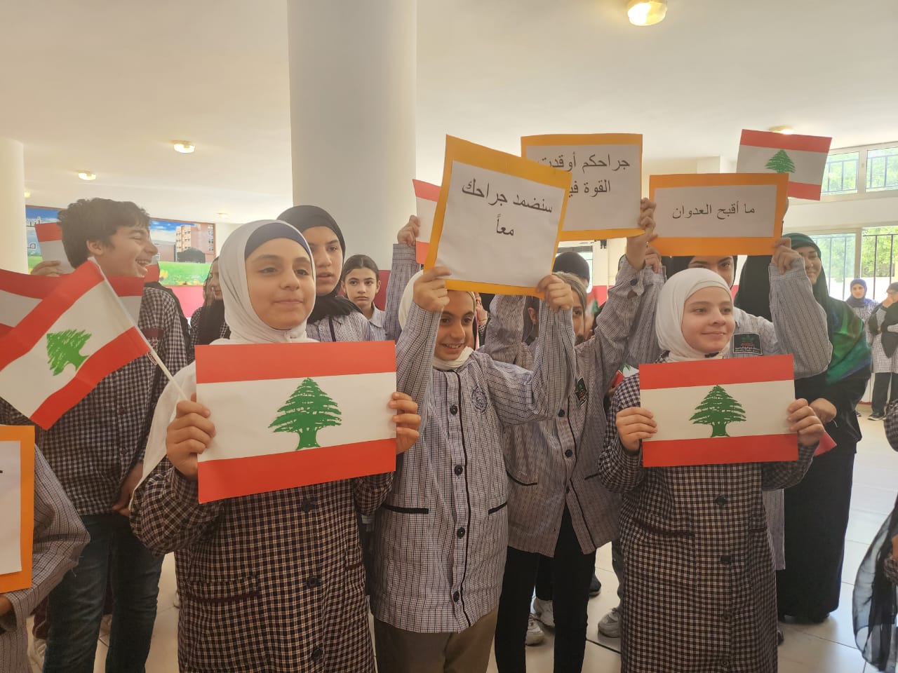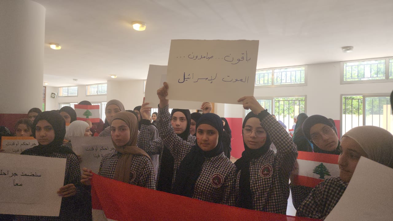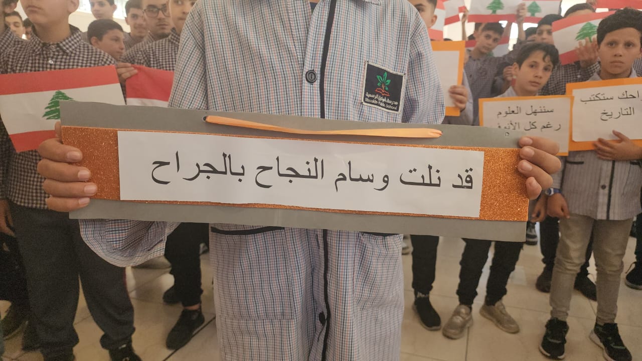 ورفع الطلاب في ملعب المدرسة وداخل الصفوف لافتات كتب على بعضها " لقد نلتم وسام النجاح بالجراح" و " سنضمد جراحكم معا" ، و " جراحكم اوقدت القوة فينا" و " جراحكم سنكتب التاريخ" و" الطالب مجاهد فكيف اذا صار جريحا"، واطلقوا هتافات الموت لاسرائيل.