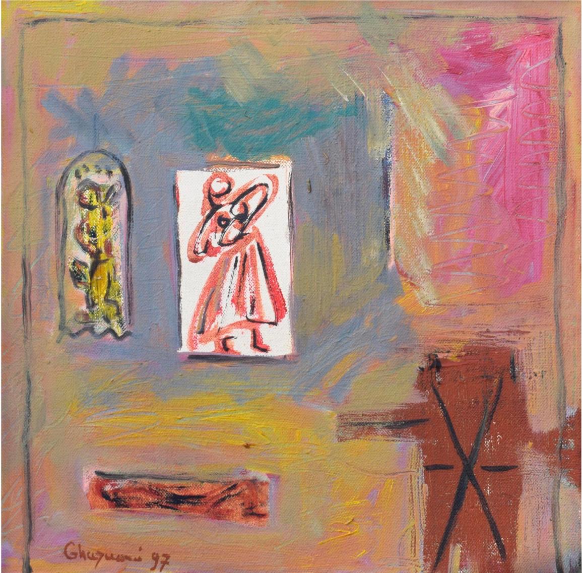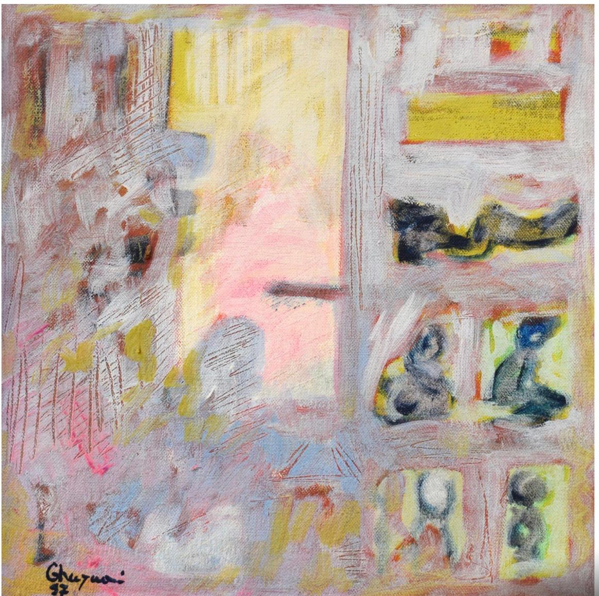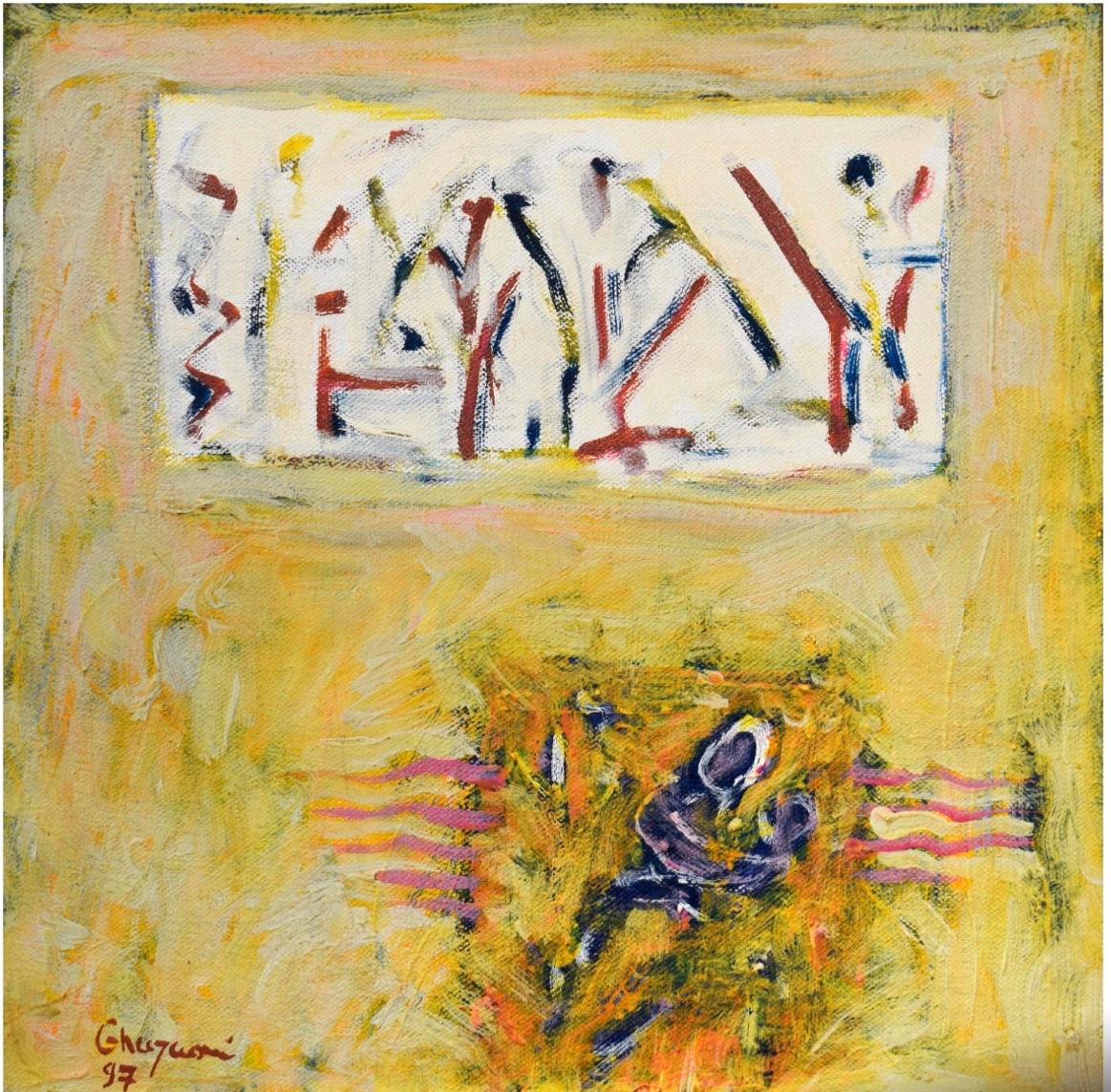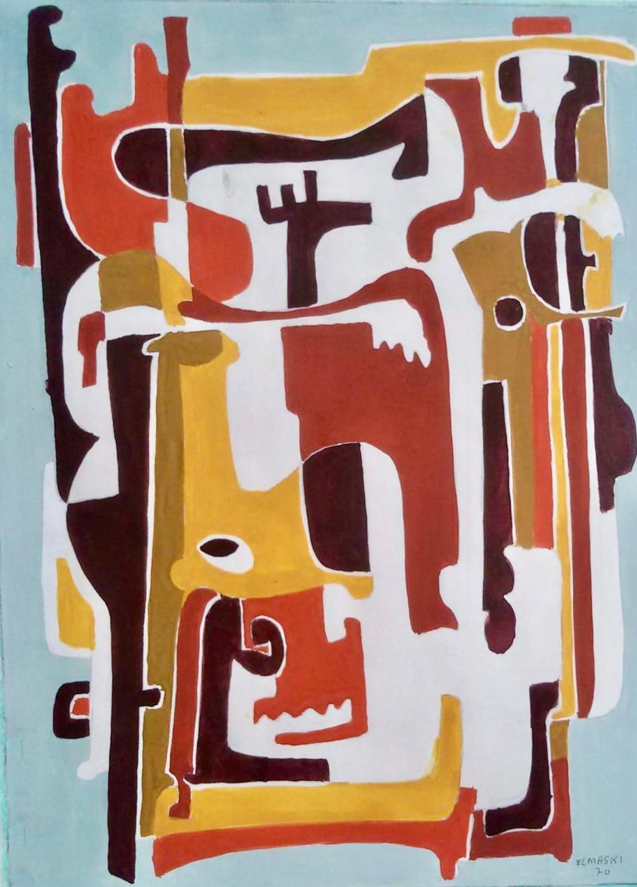 رغم تشابه اللوحات المعروضة لناحية الحجم، إلّا أنّها متنوّعة بتقنياتها وأساليبها ومفاهيمها، فأعمال الراحل عدنان المصري، ابن بيروت، يغلب عليها التجريد الهندسي المتنوّع بمساحاته وحركته العموديّة، والفريد ببساطته ونغماته اللونيّة، المليئة شجناً وطاقة وضوءاً وتناغماً بين الدافئ والبارد. حملت تجربة المصري، كما نعلم، اتجاهاً حروفيّاً واستلهاماً للفنون الشرقيّة بلونيّتها وروحيّتها الإسلاميّة وفلسفتها.