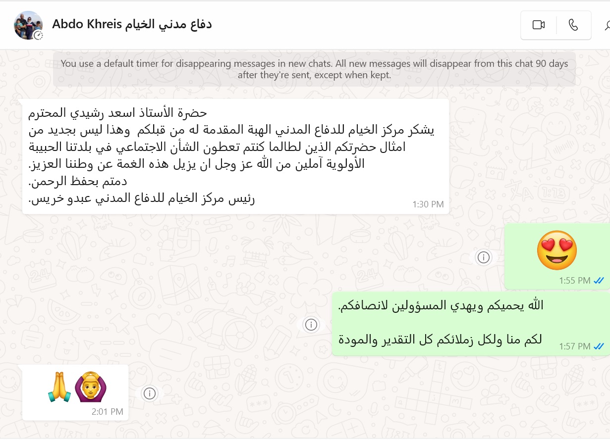 وبعد اتمام العملية، وصلتني اليوم رسالة نصّية لطيقة من السيّد عبدو خريس، رئيس مركز الدفاع المدني في الخيام، جاء فيها: