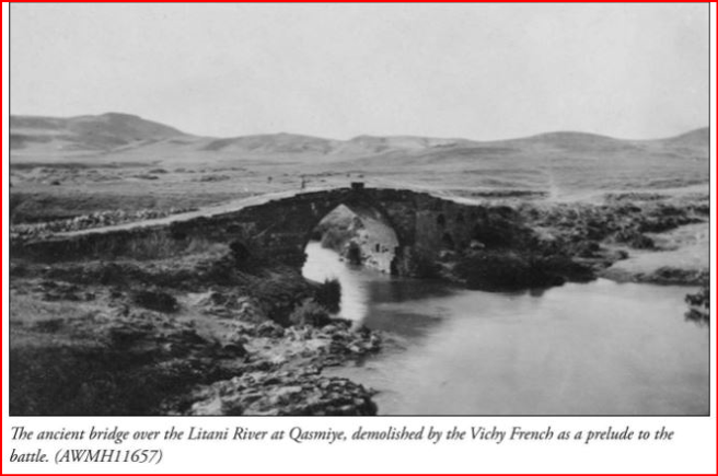 ولسوء الحظ، وبينما كانت الشاحنات والمدفعية التي تقطرها تصارع لتجاوز المصطبة الثانية البالغ عرضها حوالي ثلاثين ياردة، ظهرت قاذفة فرنسية على ارتفاع مائتي قدم، وانقضت بسرعة على الرتل لتقصفه، ففتح عليها العقيد كولز النيران من مرابض مدفعيته البريطانية من طراز Bofors التي كان قد نصبها على الربوة على مسافة تبعد حوالي خمسمائة ياردة لناحية الغرب، وبعد عدة غارات نفذتها تلك القاذفة وتبادل للرشقات النارية مع تلك المدافع، أصيبت الطائرة، ثم هوت وتحطمت، ونتج عن انفجار قنابلها دوي صوت عظيم ترددت اصدائه في الاودية والقرى المجاورة، عندها أوقفت اطقم المدافع اطلاق نيرانها واخذ الجنود يقفزون صائحين بثلاث هتافات تعبيراً عن النصر، ثم ما لبثوا ان عادوا لمتابعة وظيفتهم المتمثلة في الدفاع عن الرتل الذي كان لا يزال يغالب لتخطي آخر مصطبة.