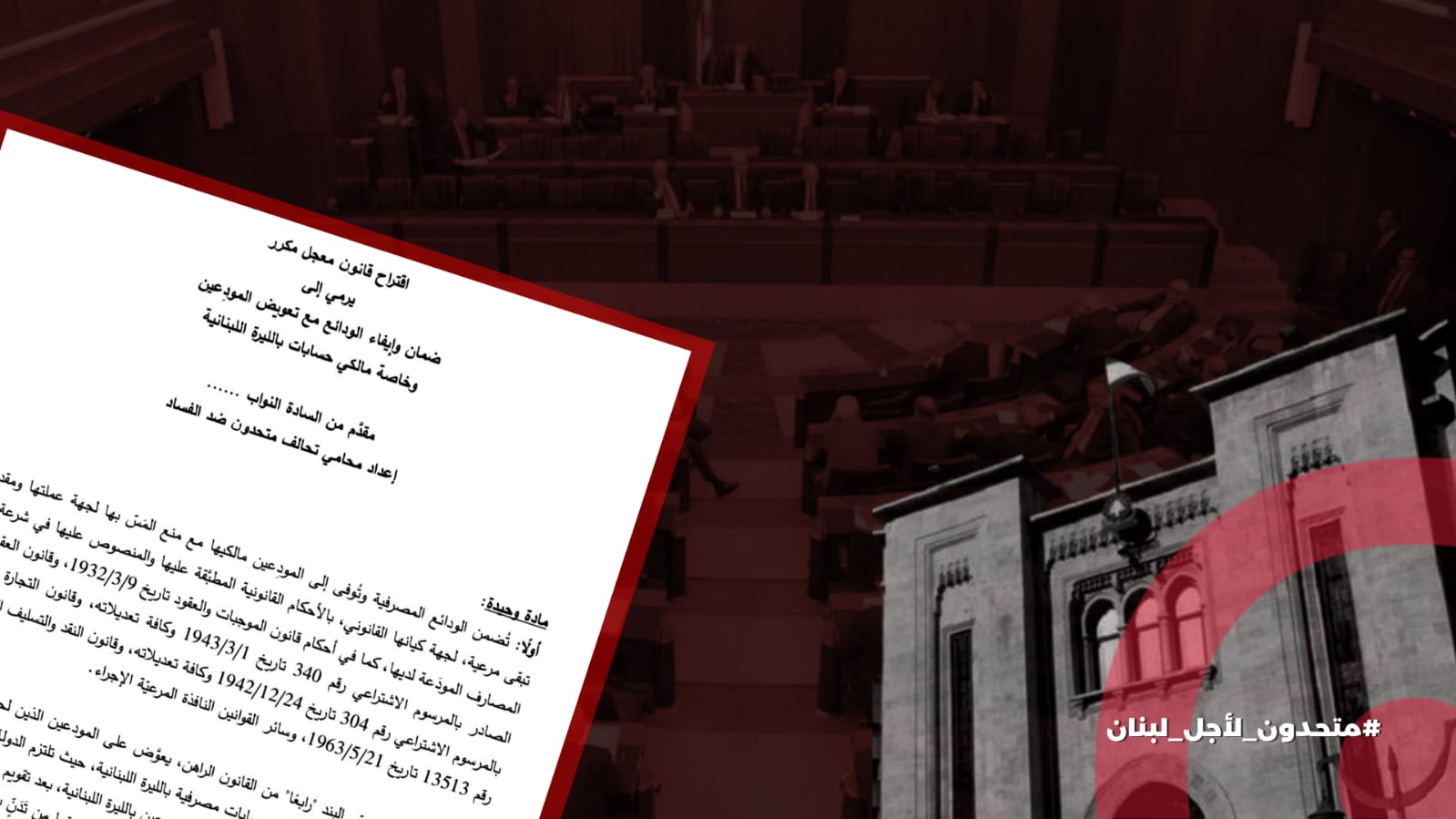 بالنسبة إلى اقتراح القانون الذي أعدّه محامو التحالف، وبعد أن استشعروا محاولات من نواب للالتفاف عليه باعتباره المسودّة الأصح لضمان وإيفاء الودائع وإعادة الثقة بالقطاع المصرفي دون أي لبس في الصياغة وآلية التطبيق، ينكب هؤلاء المحامون حالياً على طرحه ومناقشة بنوده مع قسم وازن من النواب الذين كان لهم مواقف متقدمة من قضية المودعين، قبل الانتقال إلى حوار بشأنه مع جميع النواب، حيث يجري التركيز الآن على اعتماد الصيغة الأساسية المقترحة والتي تنصّ على مهل محددة وفق البند "خامساً" من مادته الوحيدة، هي "سنتان" لضمان وإيفاء ديون المودعين لدى المصارف بالنسبة إلى المبالغ الموجودة لدى المصارف ولدى مصرف لبنان من الاحتياطي الإلزامي؛ وأربع سنوات بالنسبة إلى المبالغ المهرّبة من المصارف ومن مصرف لبنان إلى الخارج، جميعها تبدأ من تاريخ نشر القانون في الجريدة الرسمية.