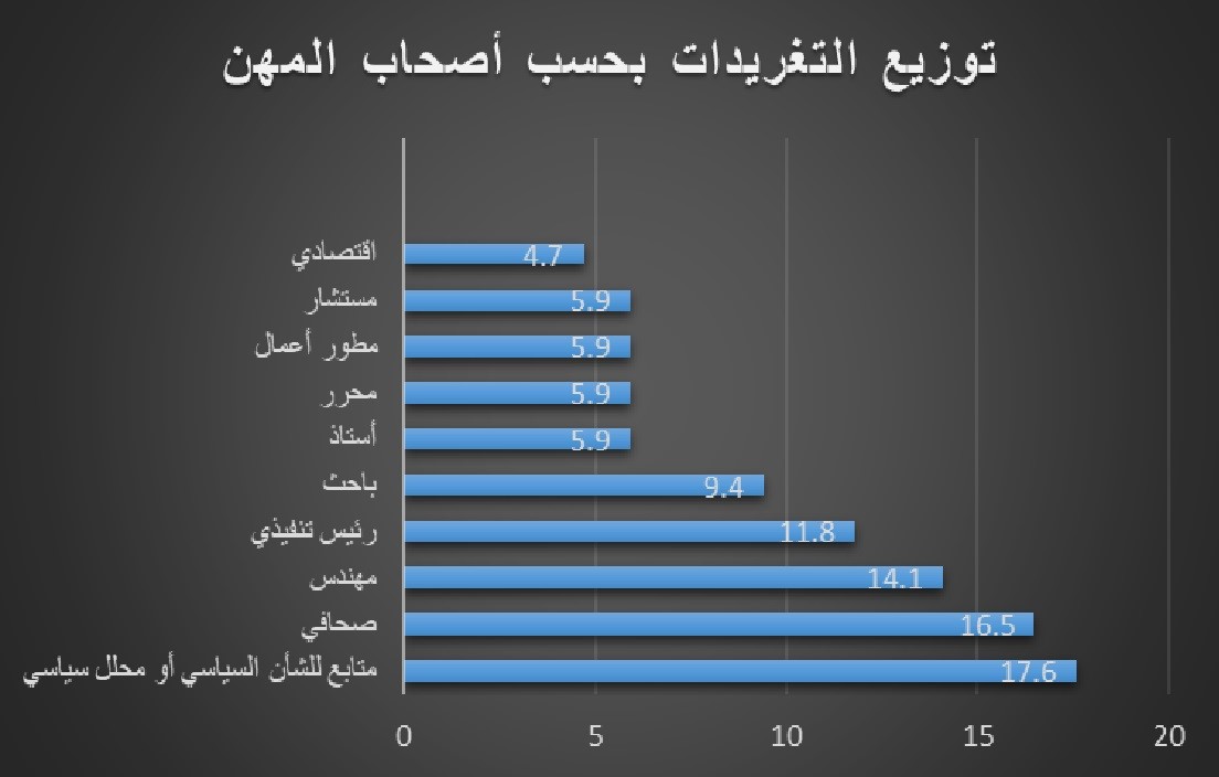 وجاءت معظم التغريدات من المواطنين من ذوي الاهتمام بالشأن السياسي، كالصحافيين، ومن ثم فئات شعبية أخرى، وقد توزعت النسب المئوية بحسب الجدول أدناه.