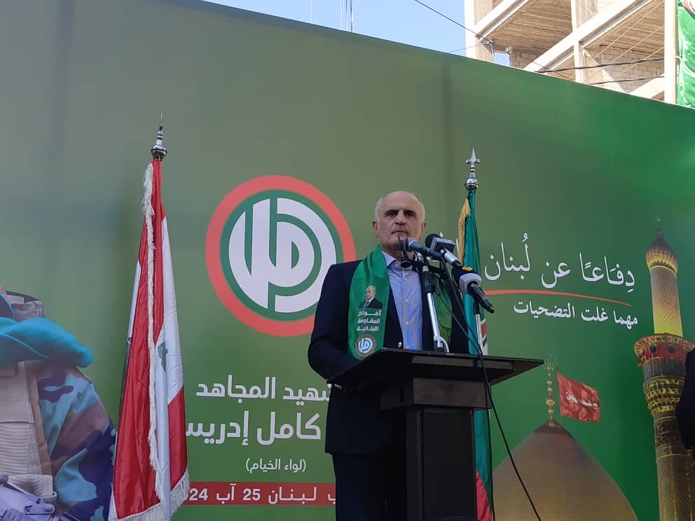 وقال:"كل قطرة دم تسقط تعني الكثير الكثير ليس للاهل فقط ، بل يجب ان تعني لكل اللبنانيين ، تسقط بعين الله ، هي من أجل كل المواطنين، كل اللبنانيين، عندما يستشهد ابناؤنا، أخوتنا انما يستشهدون دفاعا عن آخر لبناني مهما اختلفنا معه، او ألتقينا معه، لان مبادئنا ومقاومتنا هي من أجل كرامة الانسان في مواجهة عدو الانسانية الذي يرتكب المجازر المفتوحة، في فلسطين، في غزة، في الضفة الغربية وعلى امتداد حدودنا، نعم ردنا على الجرائم بمزيد من التمسك بالاهداف، لا نعمل برد الفعل والمقاومة واعية في ادارة التوازن بين عملها العسكري وبين الحركة السياسية التي يجب ان تواجه، وهي تواجه كل تقصير يتعلق بهذه المعركة ، نعم نحن معكم يا يا ابناء الامام الصدر ، يا ابناء افواج المقاومة اللبنانية "امل" ، يا كل اللبنانيين ، ننشد المقطع الثاني من نشيد حركة امل نحمي الاهداف الوطنية ، نصنع تاريخ الاجيال، وتاريخ الابطال ، ونعني معنى المسؤولية، المسؤولية ان ننفتح على كل جهد من اجل ردع اسرائيل وعدم التفريط بأي حق سيادي بما فيه حق الدفاع عن ارضنا وشعبنا ووطننا".