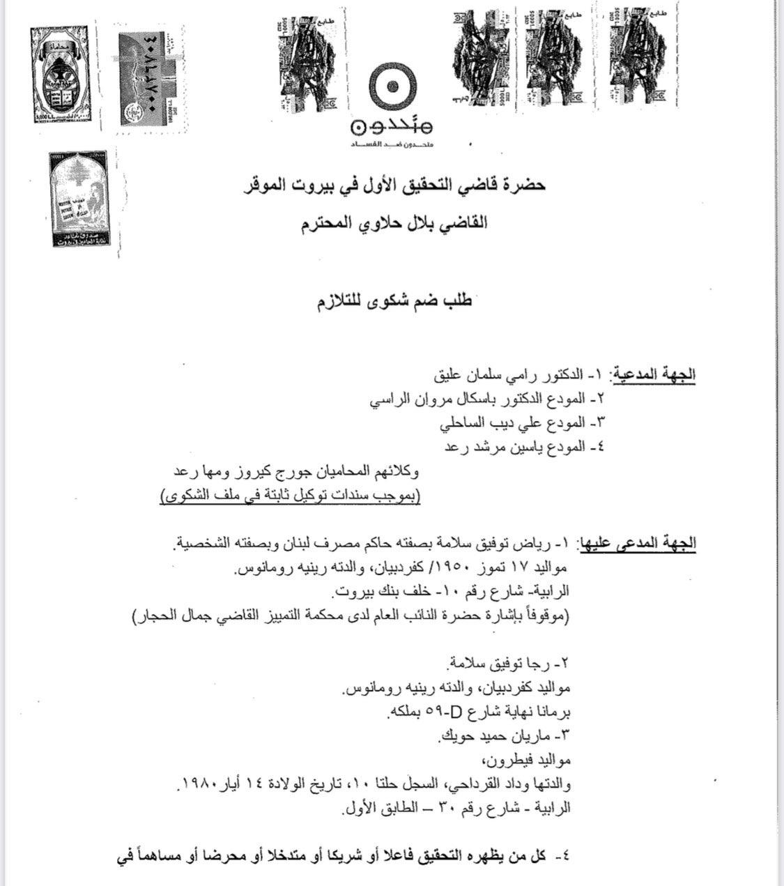عطفاً على الشكوى الأولى المقدمة من تحالف متحدون بتاريخ ٢ شباط ٢٠٢١ أمام النائب العام الاستئنافي في جبل لبنان ضد الأخوين رياض ورجا سلامة ورفاقهما والتي عرفت بقضية "فوري" لاحقاً، وعلى الشكوى المقدّمة من محامي التحالف وعدد من المودعين في المصارف اللبنانية بتاريخ ٢ آذار ٢٠٢٣ أمام قاضي التحقيق الأول في بيروت ضد الأخوين سلامة ورفاقهما على خلفية عمولات شركة "أوبتيموم إنفست" التي حلّت محل شركة فوري وأعوانها "LIBANK" وآخرين والتي عرفت بقضية "أوبتيموم" فيما بعد، وعلى المذكرة مع المستندات الثابتة ذات الصلة الصادرة عن الشرطة الجنائية القبرصية كما ووثائق مالية وعقارية أخرى، بتاريخ ١٥ آذار ٢٠٢٣، وأمام خطورة الجرائم المدّعى بها ودورها في تعزيز الفساد المالي والمصرفي المستشري في لبنان، والذي أدى إلى سرقة الودائع ومدّخرات المودعين وإلى الانهيار الاقتصادي والأزمات الحالية البالغة الخطورة، لجأ محامو التحالف اليوم ٥ أيلول ٢٠٢٤ ووفق الأصول القانونية المتّبعة إلى التقدّم بمذكرة تؤكد على طلب تقرير ضم شكواهم المنوّه عنها أمام قاضي التحقيق الأول في بيروت بالإنابة القاضي بلال حلاوي لادعاء النائب العام المالي القاضي علي ابراهيم على الحاكم الأسبق لمصرف لبنان سلامة لعلّة التلازم سنداً لنص المادة 55 من قانون أصول المحاكمات المدنية.