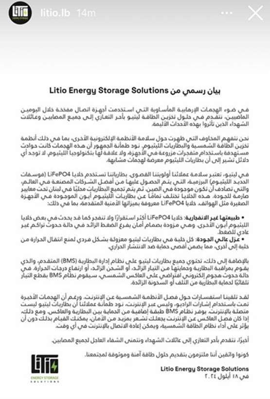وكانت قد انتشرت شائعات عن أن بطاريات الليثيوم هي المسببة للانفجارات وأن البطاريات المستخدمة في أنظمة الطاقة الشمسية، بعضها انفجر، وبرزت دعوات إلى الابتعاد عن بطاريات الطاقة الشمسية خوفاً من انفجارها، مما أدى إلى حالة هلع لدى اللبنانيين الذين يعتمدون على هذه الأنظمة.