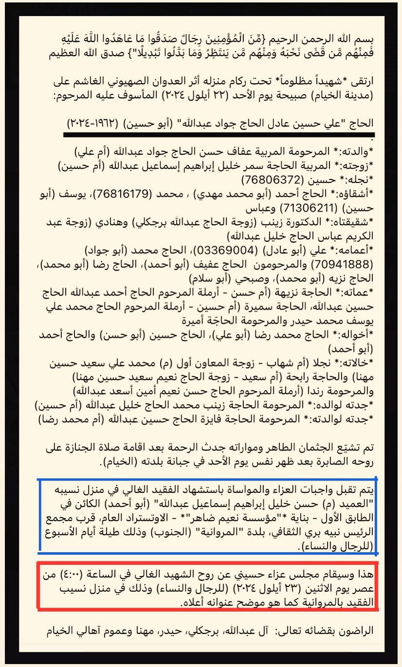 هذا وسيقام مجلس عزاء حسيني عن روح الشهيد الغالي في الساعة (٤:٠٠) من عصر يوم الاثنين (٢٣ أيلول ٢٠٢٤) (للرجال والنساء) وذلك في منزل نسيب الفقيد بالمروانية كما هو موضح عنوانه أعلاه.