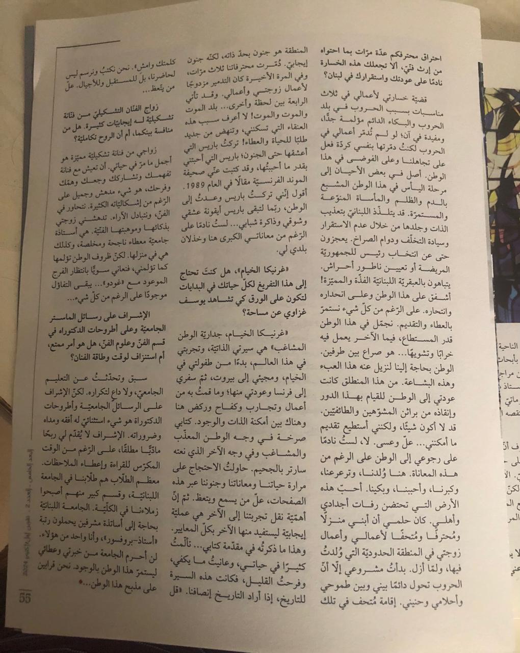 قضيّة خسارتي لأعمالي في ثلاث مناسبات بسبب الحروب في بلد الحروب والبكاء الدائم، مؤلمة جدًّا، ومفيدة في آن؛ لو لم تُدمّر أعمالي لكنتُ دمّرتها بنفسي كردّة فعل على الفوضى في هذا الوطن. أصل بعض الأحيان إلى مرحلة اليأس في هذا الوطن المشبع بالدم والظلم والمأساة المنوّعة. قد يلتذّ اللبنانيّ بتعذيب الذات وجلدها من خلال عدم الاستقرار وسيادة التخلّف ودوام الصراخ. يعجزون حتى عن انتخاب رئيس للجمهوريّة المريضة أو تعيين ناطور أحراش. يتباهون بالعبقريّة اللبنانيّة الفذّة والمميّزة! أشفق على هذا الوطن وعلى انحداره وانتحاره. بالرّغم من كلّ شيء نستمرّ بالعطاء والتقديم. نجمّل في هذا الوطن قدر المسنطاع، فيما الآخر يعمل فيه خرابًا وتشويهًا.. هو صراع بين طرفين. الوطن بحاجة إلينا لنزيل عنه هذا العبء وهذه البشاعة. من هذا المنطلق كانت عودتي للوطن للقيام بهذا الدور لإنقاذ الوطن من براثن المشوّهين والطائفيّين. قد لا أكون شيئًا، لكن أستطيع تقديم ما أمكنني.. علّ وعسى. لا، لستُ نادمًا على رجوعي للوطن رغم هذه المعاناة. هنا وُلدنا، وترعرعنا، وكبرنا، وأحببنا، وبكينا. أحبّ هذه الأرض التي تحتضن رفات أجدادي وأهلي. كان حلمي أن أبني منزلًا ومُحترفًا ومُتحفًا لأعمالي وأعمال زوجتي في المنطقة الحدوديّة التي وُلدتُ فيها، ولمّا أزل. بدأتُ مشروعي إلّا أنّ الحروب تحول دائمًا بيني وبين طموحي وأحلامي وحنيني. إقامة مُتحف في تلك المنطقة هو جنون بحدّ ذاته. لكنّه جنون إيجابيّ. دُمّرت محترفاتنا ثلاث مرّات، والأخيرة منها كان تدميرًا مزدوجًا لأعمال زوجتي وأعمالي. وقد تأتي الرابعة بين لحظة وأخرى.. بلد الموت والموت والموت! لا أعرف سبب هذه العنقاء التي تسكنني، وتنهض من جديد طلبًا للحياة والعطاء! تركتُ باريس التي أعشقها حتى الجنون؛ باريس التي أحبتني بقدر ما أحببتُها، وقد كتبت عنّي صحيفة الموتد الفرنسيّة مقالًا. أقول، أنّي تركتُ باريس وعدتُ إلى الوطن، ربّما لتبقى باريس أيقونة عشقي وشوقي وذاكرة شبابي.. لستُ نادمّا بالرّغم من خذلان بلدي لي.