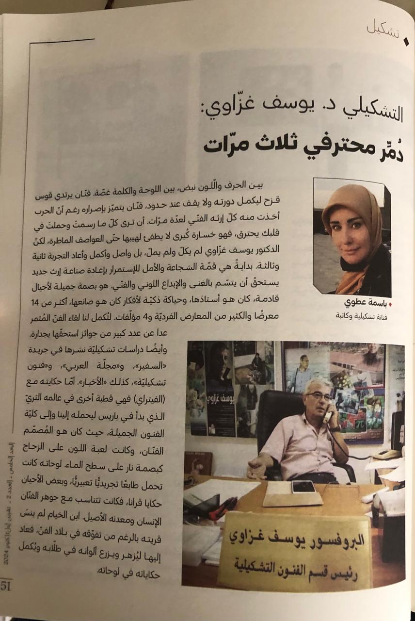 مقابلة مع الدكتور يوسف غزاوي، أجرته الكاتبة والفنانة الرسامة باسمة عطوي، ظهرت في الدوريّة الثقافيّة "البعد الخامس" في عددها الثاني لهذا الشهر تشرين أوّل بالرّغم ممّا يمرّ به هذا الوطن من مخاض وحرب شرسة تدميريّة..