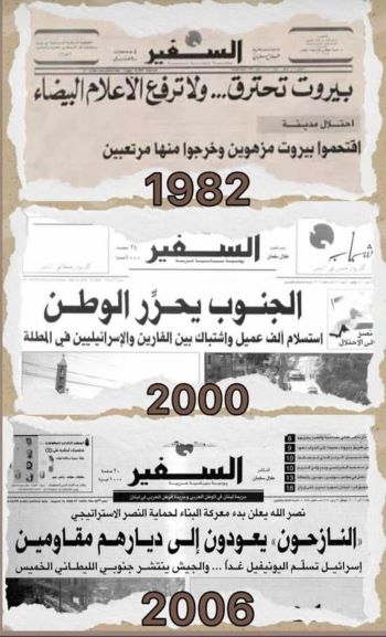 كان اجتياح “عملية الليطاني” 1978 تأسيساً لاجتياح “عملية سلامة الجليل” 1982، فالأول بذريعة إبعاد العمليات عن الحدود احتل فيه المرتفعات الحدودية المحاذية المشرفة على الشمال الفلسطيني شرقاً، وعلى الجنوب اللبناني غرباً وشمالاً، لتحرس حزامه الأمني بعملائه الذين اتخذهم درعاً بشرياً لجنوده. أما الثاني فكان بذريعة إبعاد صواريخ الكاتيوشا الفلسطينية واللبنانية 40 كلم عن الحدود والمستوطنات الشمالية إلى نهر الأولي على مدخل مدينة صيدا الشمالي، فإذا به يكمل الى العاصمة، ليبدأ بالتقهقر لاحقاً وتبدأ معه مرحلة المقاومة بعنوان صحيفة “السفير”: “بيروت تحترق ولا ترفع الأعلام البيضاء” بالرغم من ارتكاب العدو وعملائه مجزرة صبرا وشاتيلا (3000 شهيد مدني فلسطيني ولبناني) ليوظف ذلك كله لبنانياً، رئاسة للجمهورية بالتعيين واتفاقية ذل بعنوان “17 أيار”، واحتلالاً استولد مقاومة وطنية- إسلامية طردت آخر جنوده منها عام 2000، لتختصر “السفير” ثلاثية الاحتلال والمقاومة والتحرير بعنوان “الجنوب يُحرّر الوطن”.
