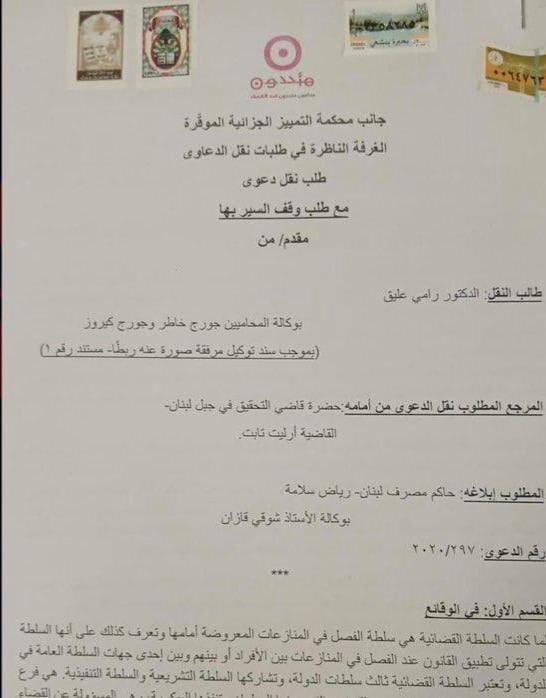 في سياق متابعة الدعاوى القضائية التي تقدّم بها محامو تحالف متحدون بهدف حفظ "حقوق المودعين"، أجابت قاضي التحقيق في جبل لبنان أرليت تابت على طلب نقل الشكوى الجزائية ضد المدّعى عليه الحاكم الأسبق لمصرف لبنان رياض سلامة المسجّل برقم ٢٠٢٤/٦٨ لدى محكمة التمييز الجزائية والذي تبلّغته في ٢٠ حزيران ٢٠٢٤، هذه الشكوى هي الأولى ضد سلامة والتي كان تقدّم بها المحامي الدكتور رامي علّيق بتاريخ ١٠ تموز ٢٠٢٠ حيث كان أحالها قاضي التحقيق الأول أمام قاضي التحقيق (المستقيل) زياد مكنّا قبل إحالتها أمام القاضية تابت. وقد طلبت القاضية رنده كفوري لدى محكمة التمييز إرسال ملف الدعوى إلى المحكمة بعد ورود طلب القاضية تابت.