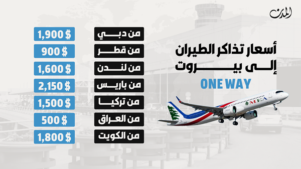 بلغ معدّل سعر تذكرة الطيران خلال الشهر الحالي من باريس إلى بيروت عبر شركة طيران الشرق الأوسط "الميدل إيست" 2150 دولاراً ومن لندن إلى بيروت 1600 دولار. أما من دبي إلى بيروت فوصل سعر التذكرة إلى 1900 دولار في حين تتوفّر تذاكر بسعر أدنى بشكل ملحوظ لكن مع محطة توقف لمدة لا تقل عن 24 ساعة. ومن العراق إلى بيروت بلغ سعر التذكرة 500 دولار ومن قطر 900 دولار ومن الكويت 1800 دولار ومن تركيا 1500 دولار.