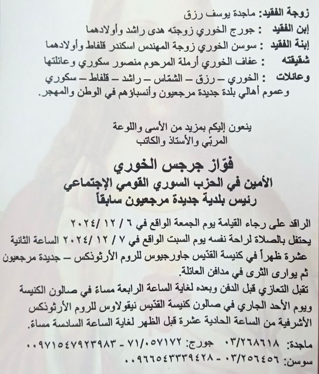 فوّاز جرجس الخوري المربّي والكاتب والأديب والأمين غادرنا اليوم وغادر معه فصل من تاريخ جديدة مرجعيون ومن تاريخ جبل عامل.