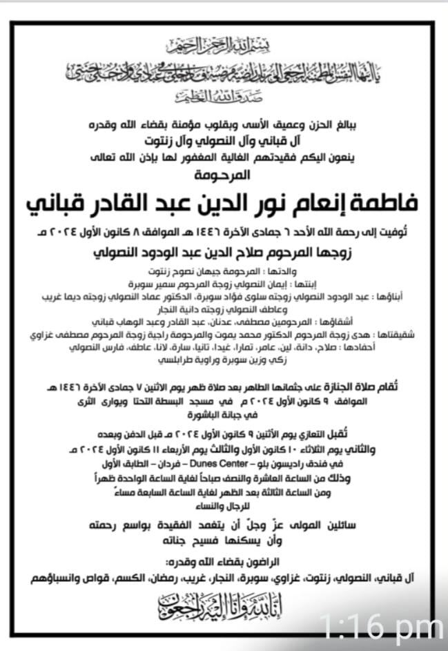 غيّب الموت السيدة الفاضلة فاطمة إنعام نور الدين عبدالقادر قباني، أرملة المرحوم صلاح الدين عبد الودود النصولي، حفيدة مؤسّس جمعية المقاصد الخيرية الاسلامية في بيروت الشيخ عبدالقادر قباني عام 1878.
