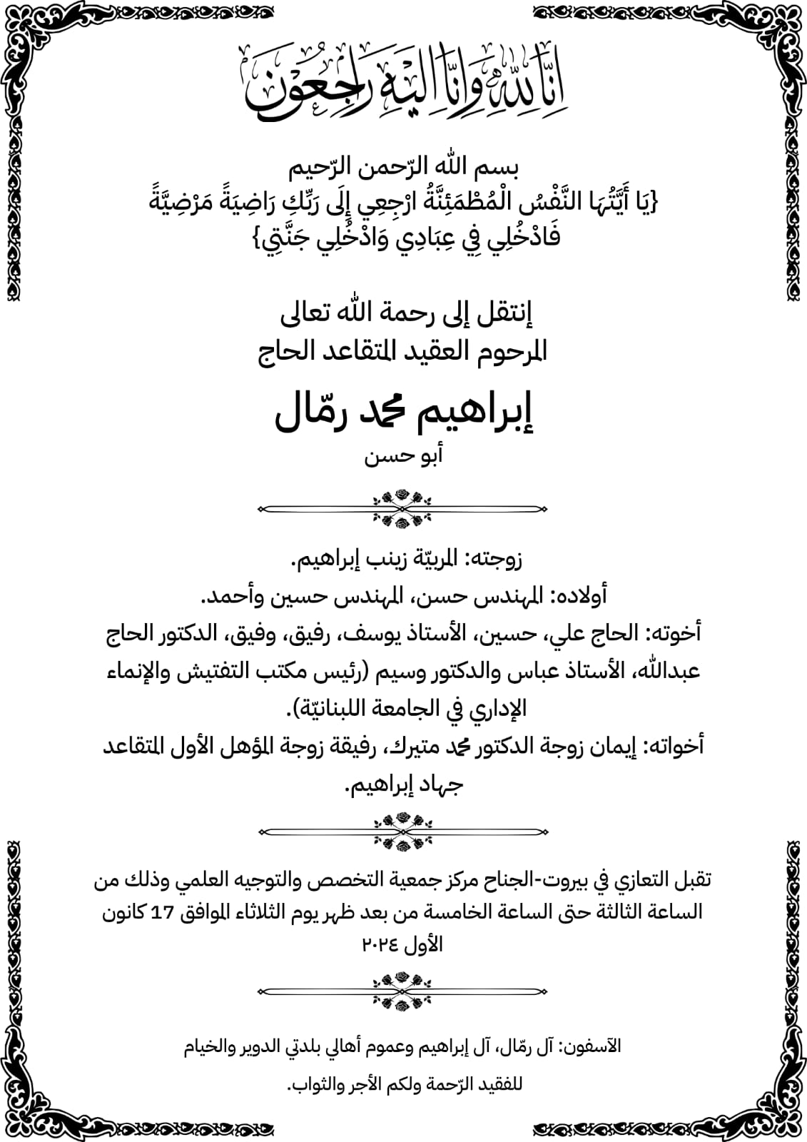 تقبل التعازي في بيروت -الجناح في مركز جمعية التخصص والتوجيه العلمي وذلك من الساعة الثالثة حتى الساعة الخامسة من بعد ظهر يوم الثلاثاء لموافق 17 كانون الأول 2024