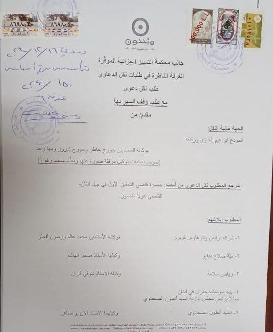 تقدّم اليوم ١٦ كانون الأول ٢٠٢٤ محامو تحالف متحدون أمام محكمة التمييز الجزائية بطلب نقل دعوى المودعين ضد المدّعى عليهم الحاكم الأسبق لمصرف لبنان رياض سلامة ورئيسة لجنة الرقابة على المصارف لديه ميه دباغ ومصرف SGBL وصاحبه أنطون الصحناوي وشركة برايس واترهاوس كوبرز (PwC) وعدد من الصيارفة، وذلك من أمام قاضي التحقيق الأول في جبل لبنان نقولا منصور إلى قاضٍ آخر نزيه لعلّة الارتياب المشروع، على خلفية تجاوزاته في ارتكاب التزوير والتلاعب غير القانوني وغير الأخلاقي بدعاوى المودعين بهدف تهريب نافذين حوّلوا عن طريق المركزي والمصارف والصيارفة أموالهم، أي أموال المودعين، إلى الخارج مع بداية الأزمة المصرفية.
