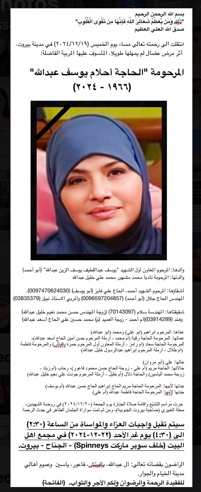 انتقلت الى رحمته تعالى مساء يوم الخميس (٢٠٢٤/١٢/١٩) في مدينة بيروت، أثر مرض عضال لم يمهلها طويلا، المأسوف عليها المربية الفاضلة: