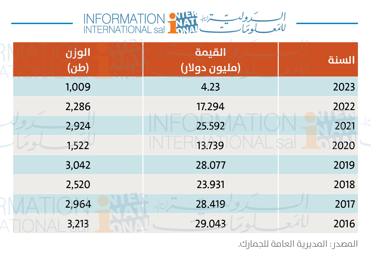 وقد شهدت هذه الكميات تراجعًا كبيرًا عن السنوات الماضية وفقًا لما هو مبين في الجدول التالي. ولكن المتوسط السنوي بقيَ مرتفعًا ووصل إلى 21.3 مليون دولار خلال السنوات 2016- 2023.